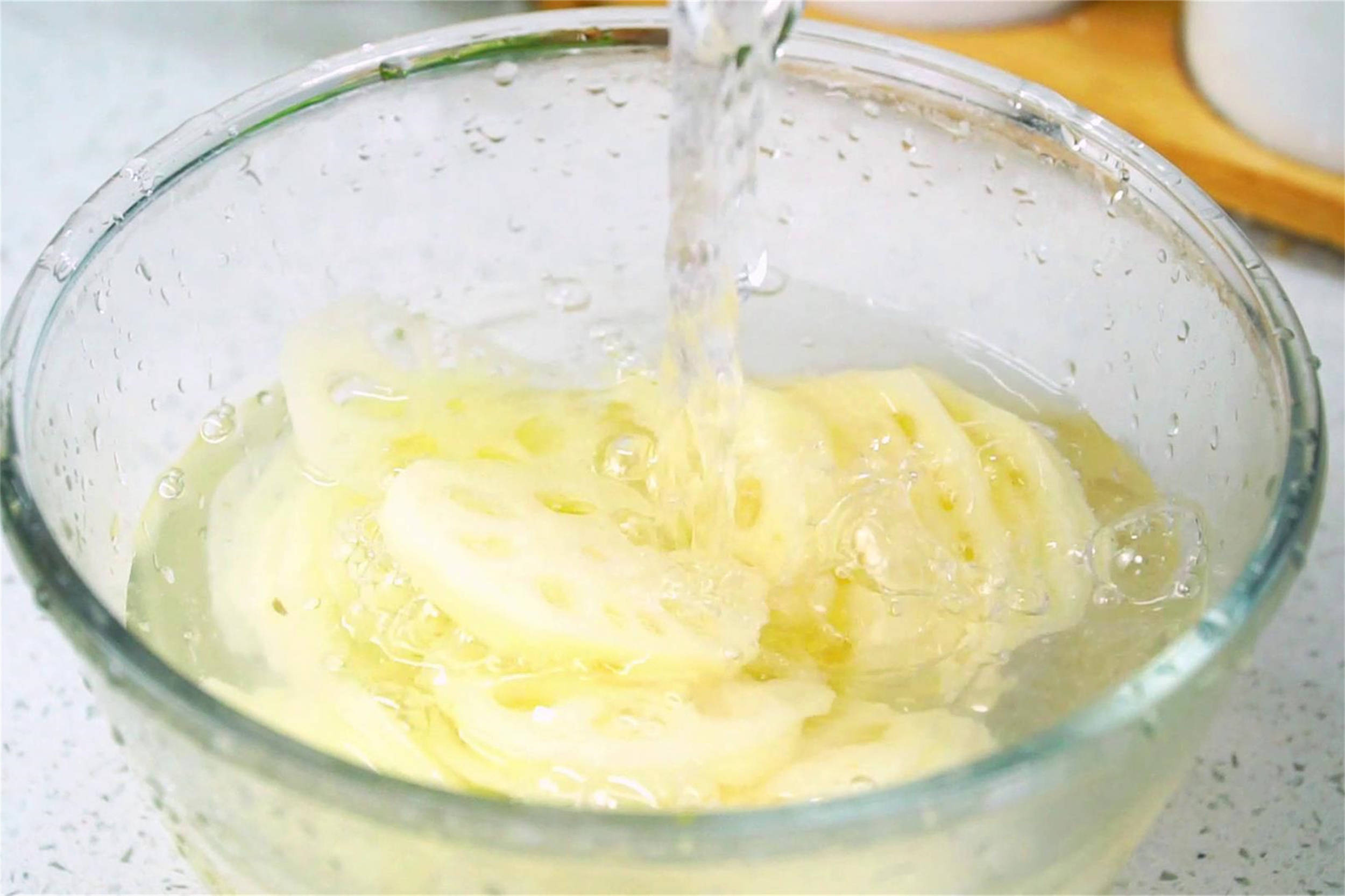1、莲藕洗净去皮,切片放入清水中,加入适量的盐浸泡20分钟,让莲藕片变软。