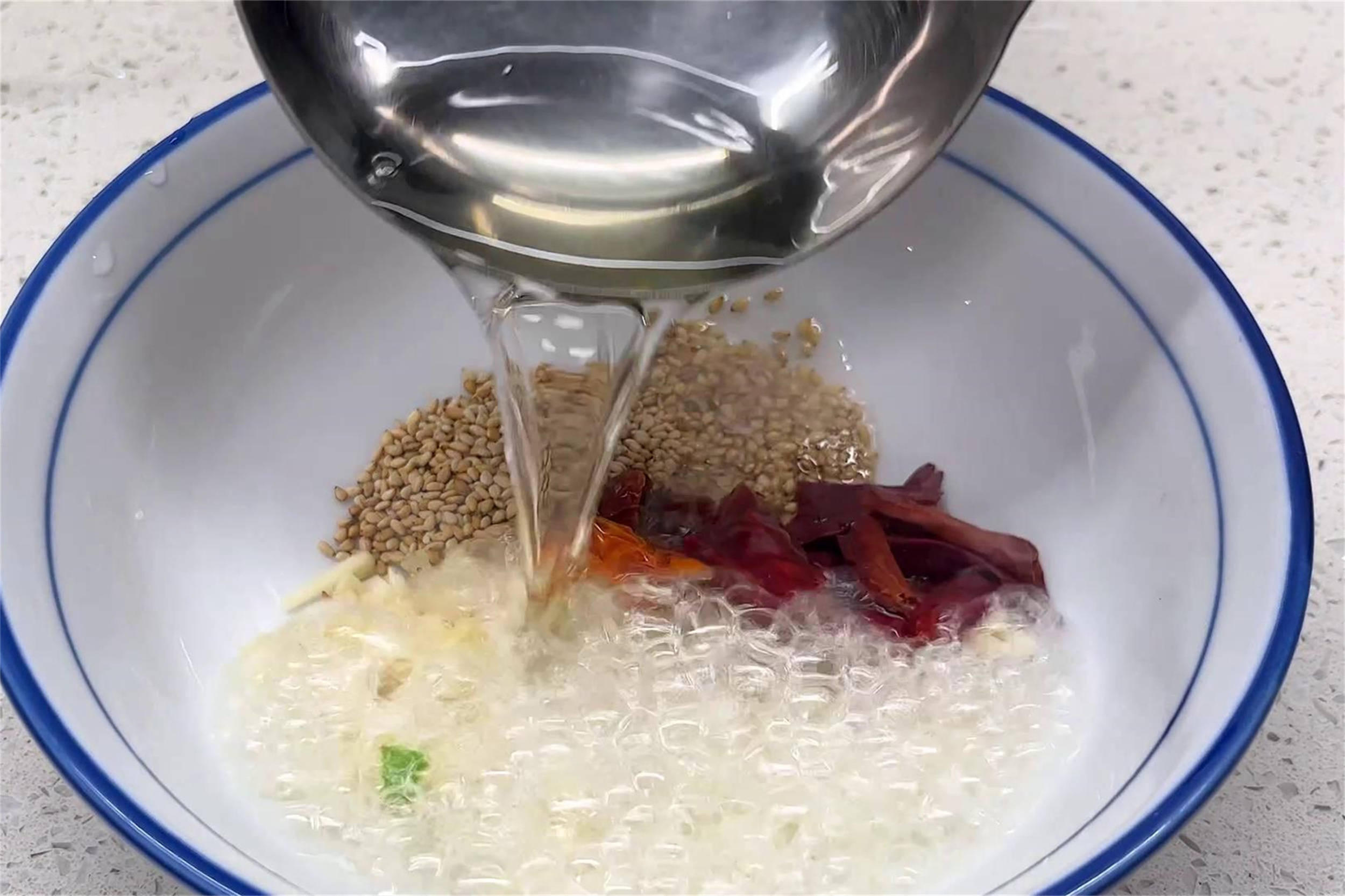 4、碗中加入蒜末、白芝麻和干辣椒,浇上热油激发出香味,倒入2勺生抽、1勺米醋、适量的盐和鸡精搅拌均匀。