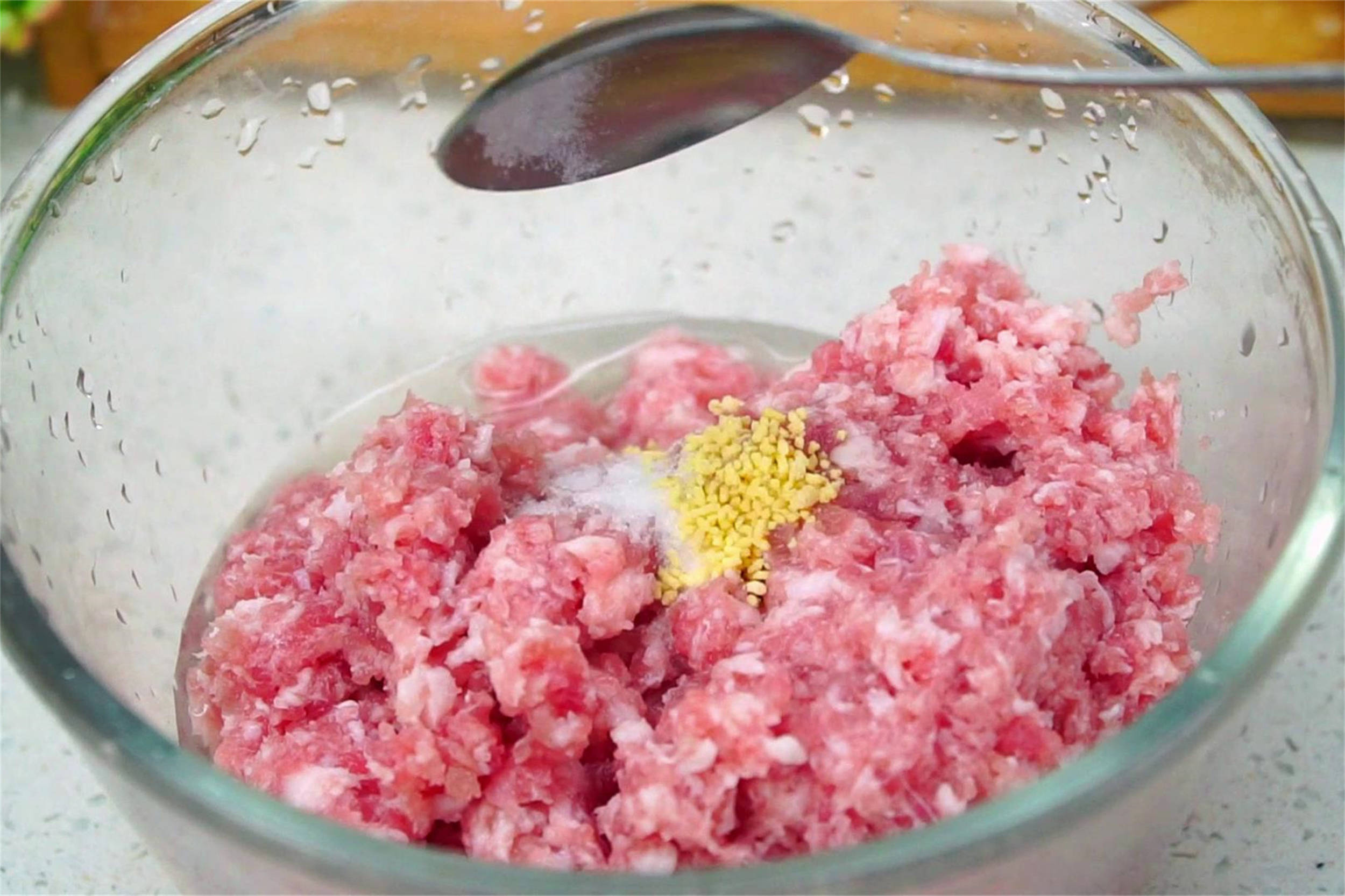 2、准备好的肉馅中,加入盐和鸡精搅拌至上劲,将一个鸡蛋的蛋白和蛋清分开,蛋清加入肉馅中搅拌至上劲。