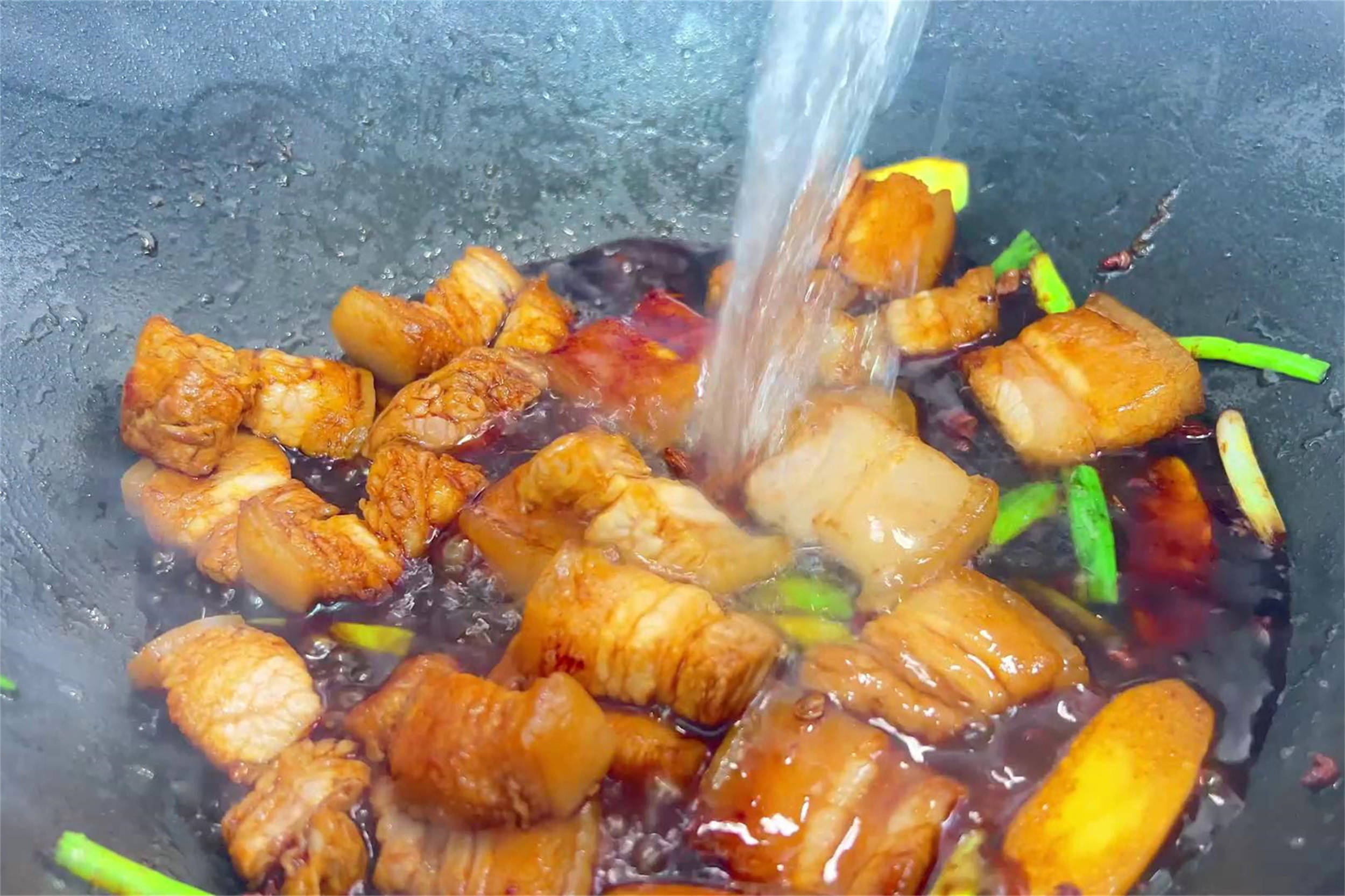 2、锅中加入2勺生抽、适量的老抽、一勺料酒翻炒均匀后,倒入适量的开水炖煮15分钟。