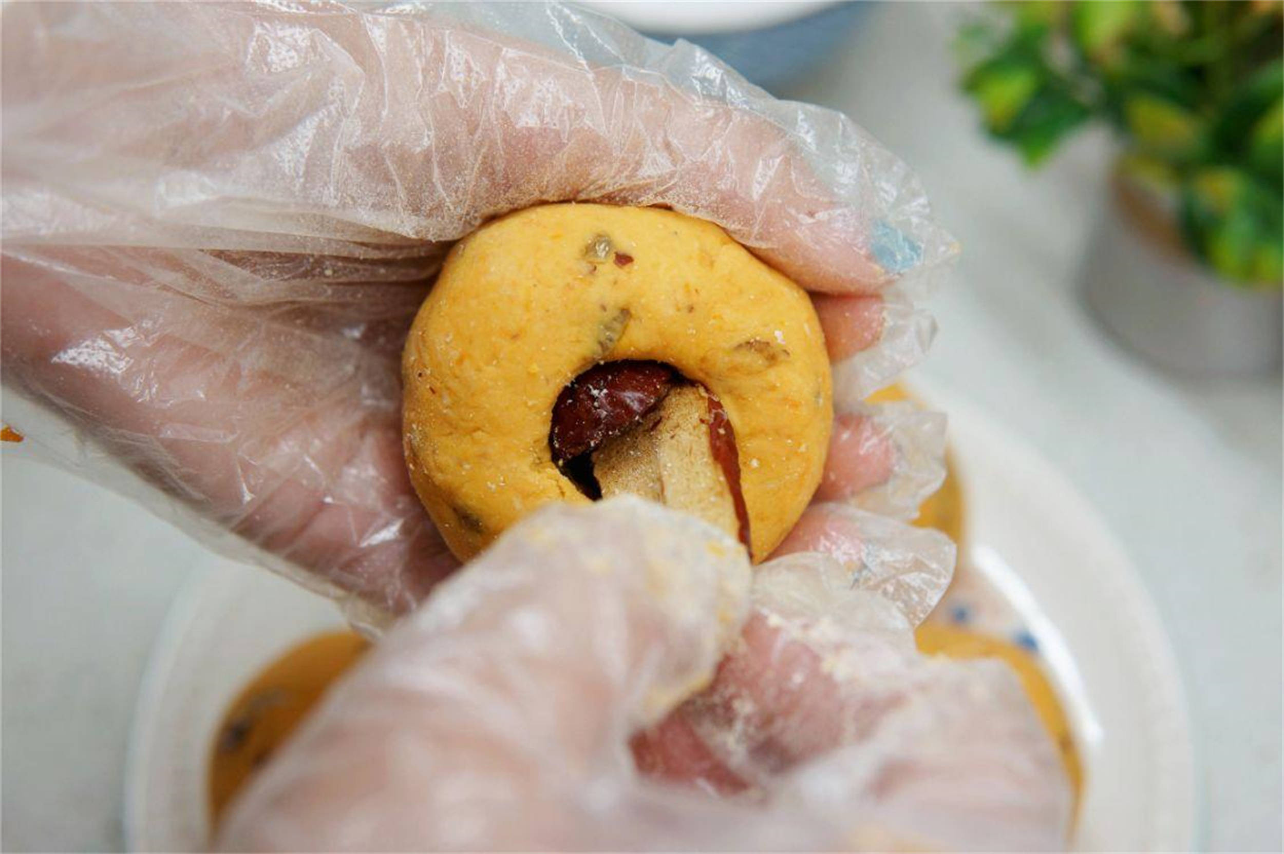 3、糯米粉团分若干份,团成窝窝头的形状,塞入红枣条。