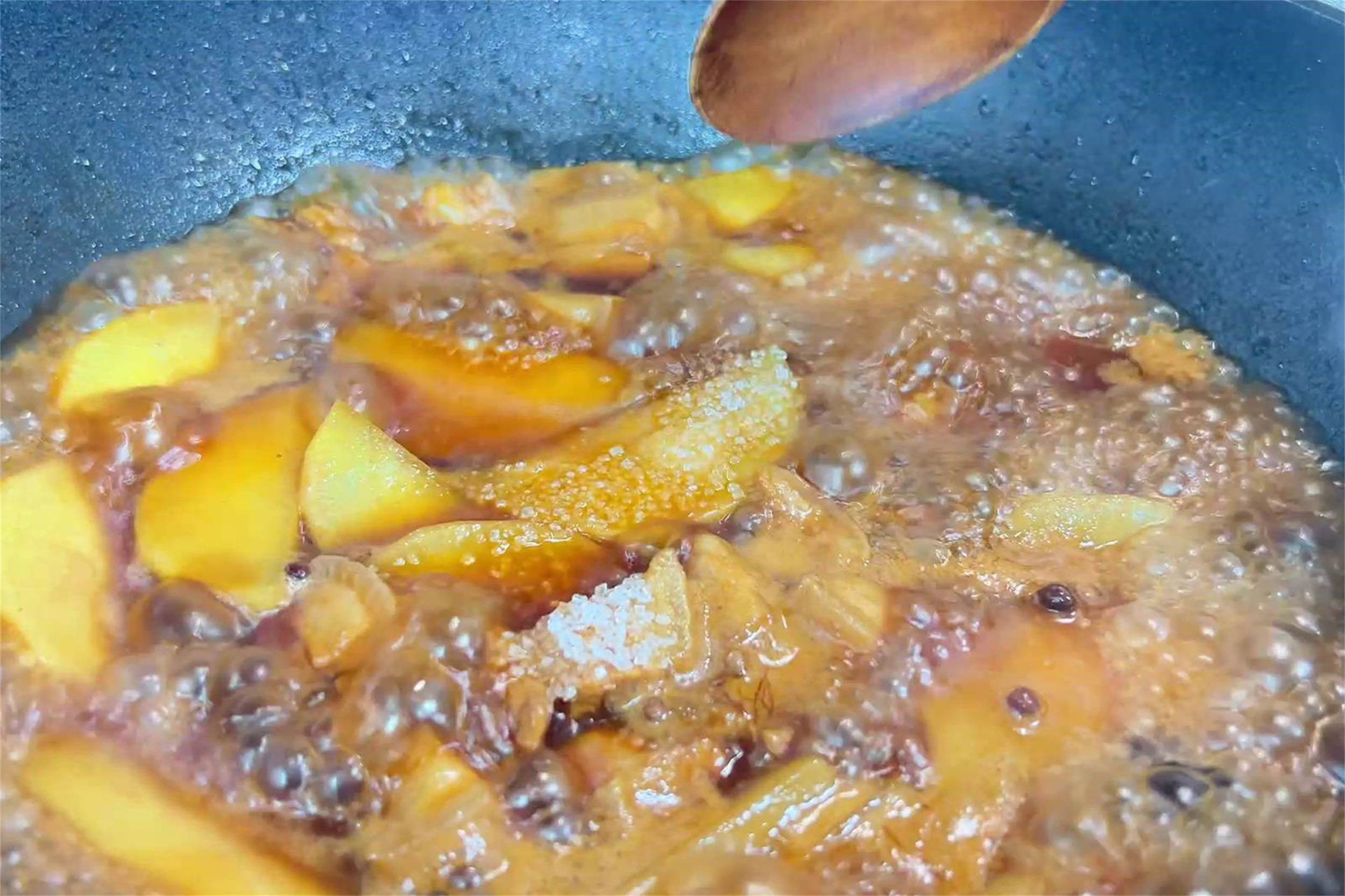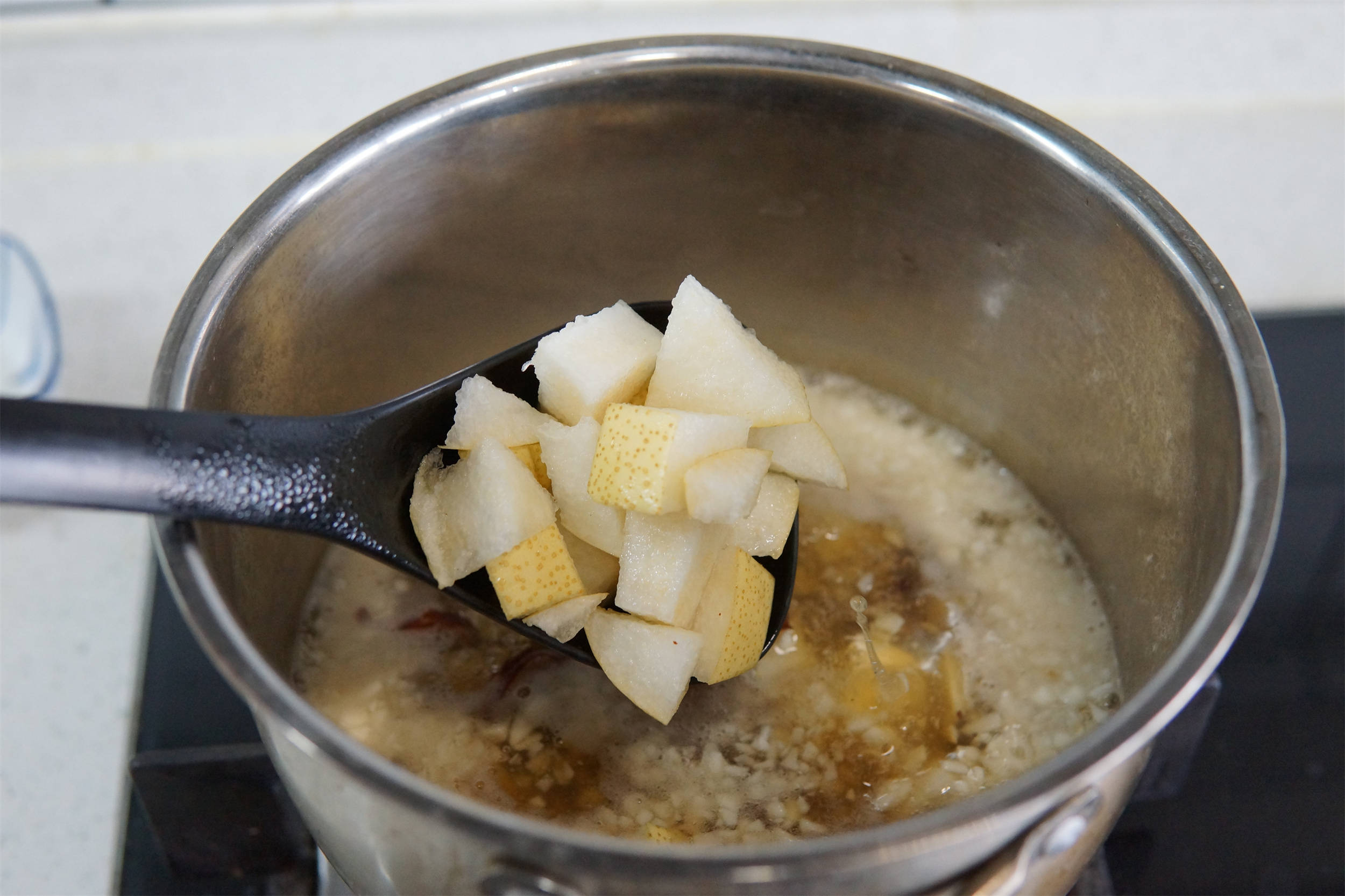 3、梨洗净切块,与枸杞和红糖一同放入锅中,煮1分钟左右即可。