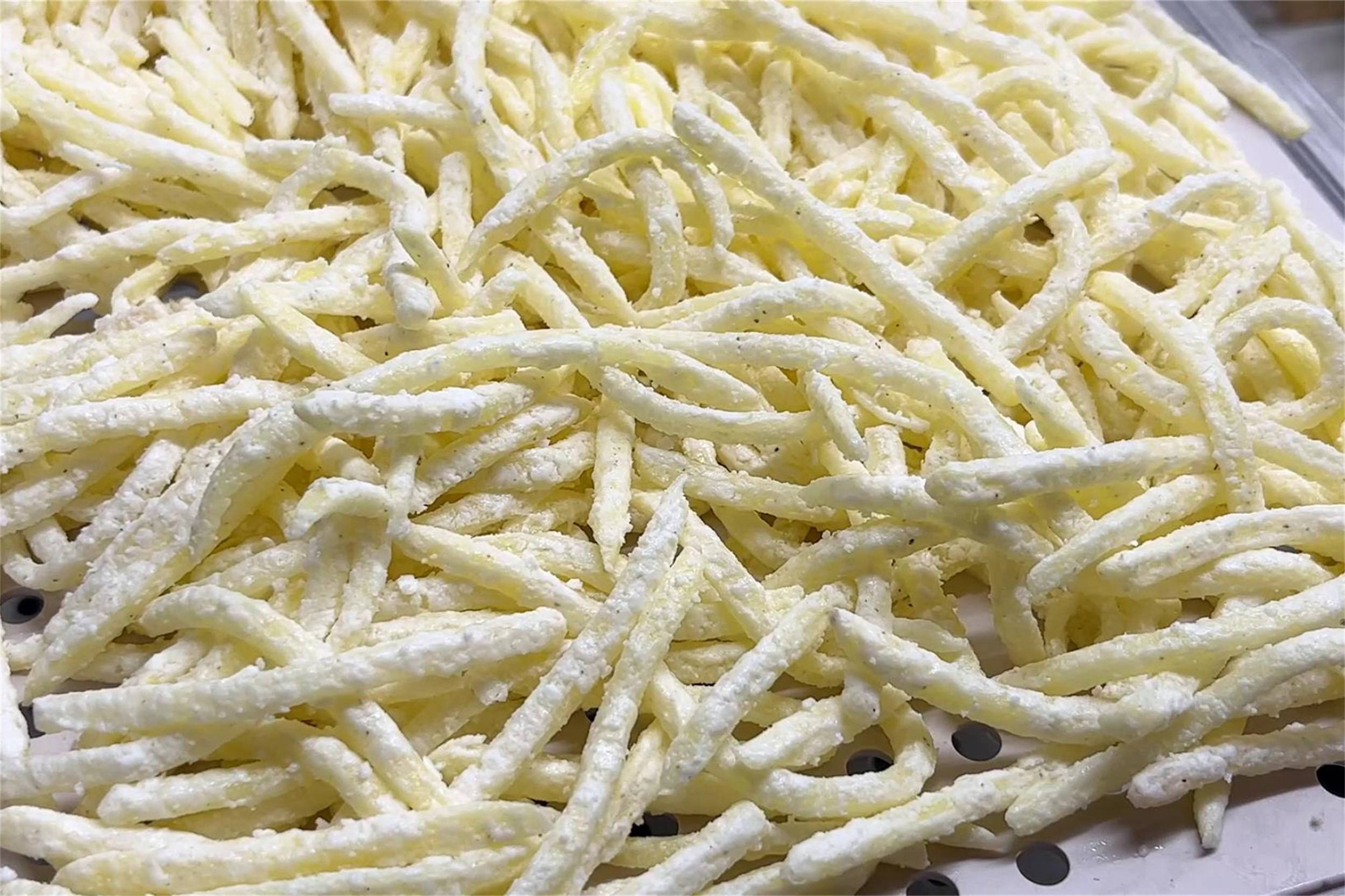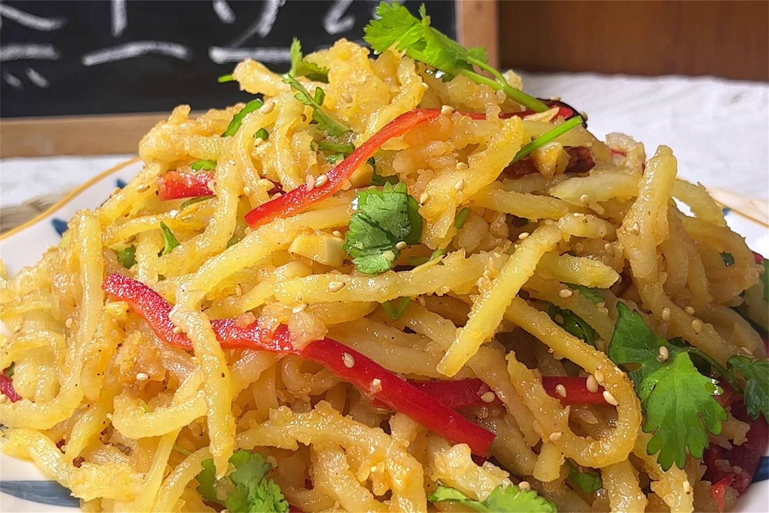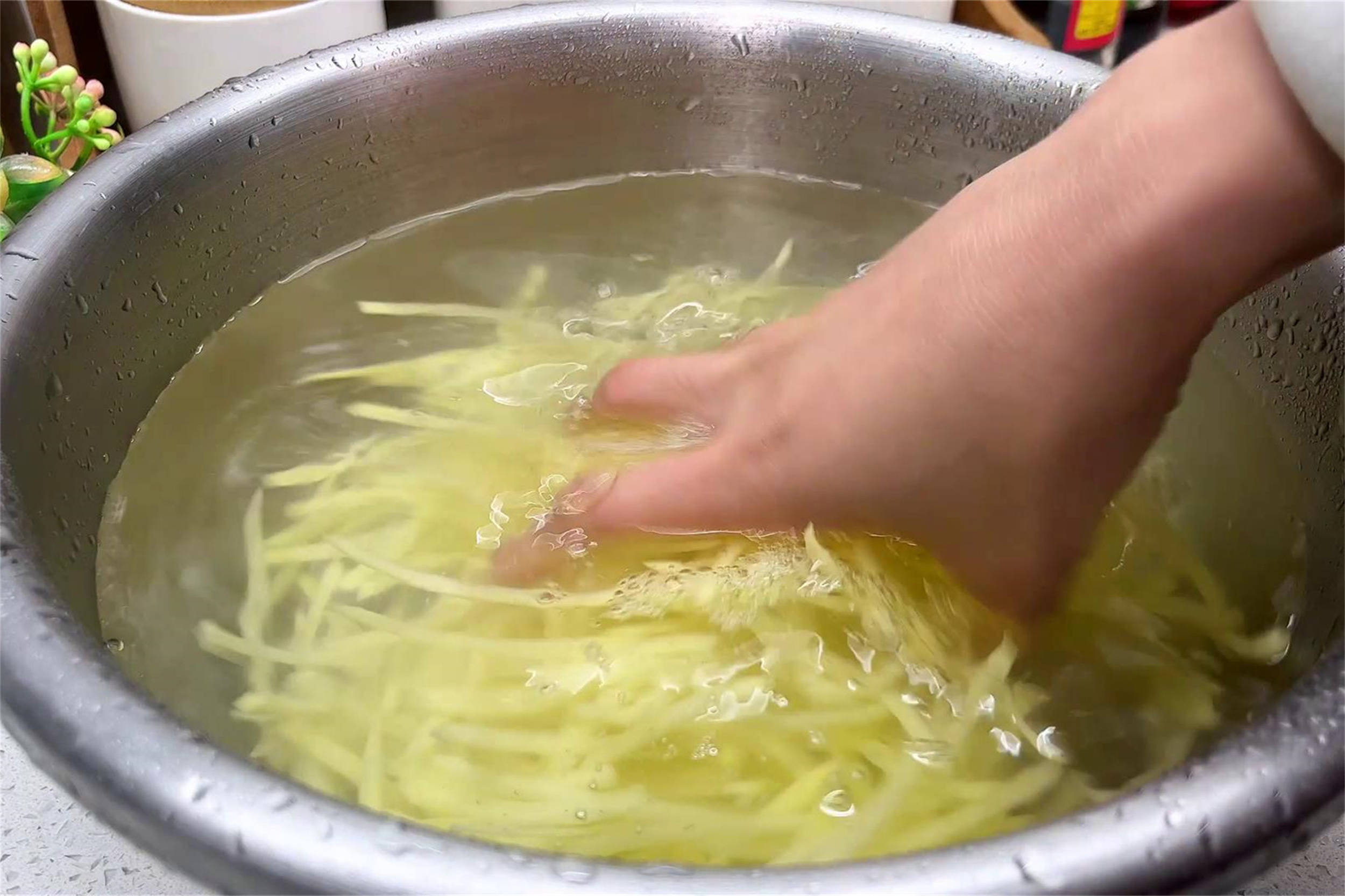 1、土豆洗净去皮,擦成细丝放入清水中洗去表面的淀粉,捞出控干表面的水分。