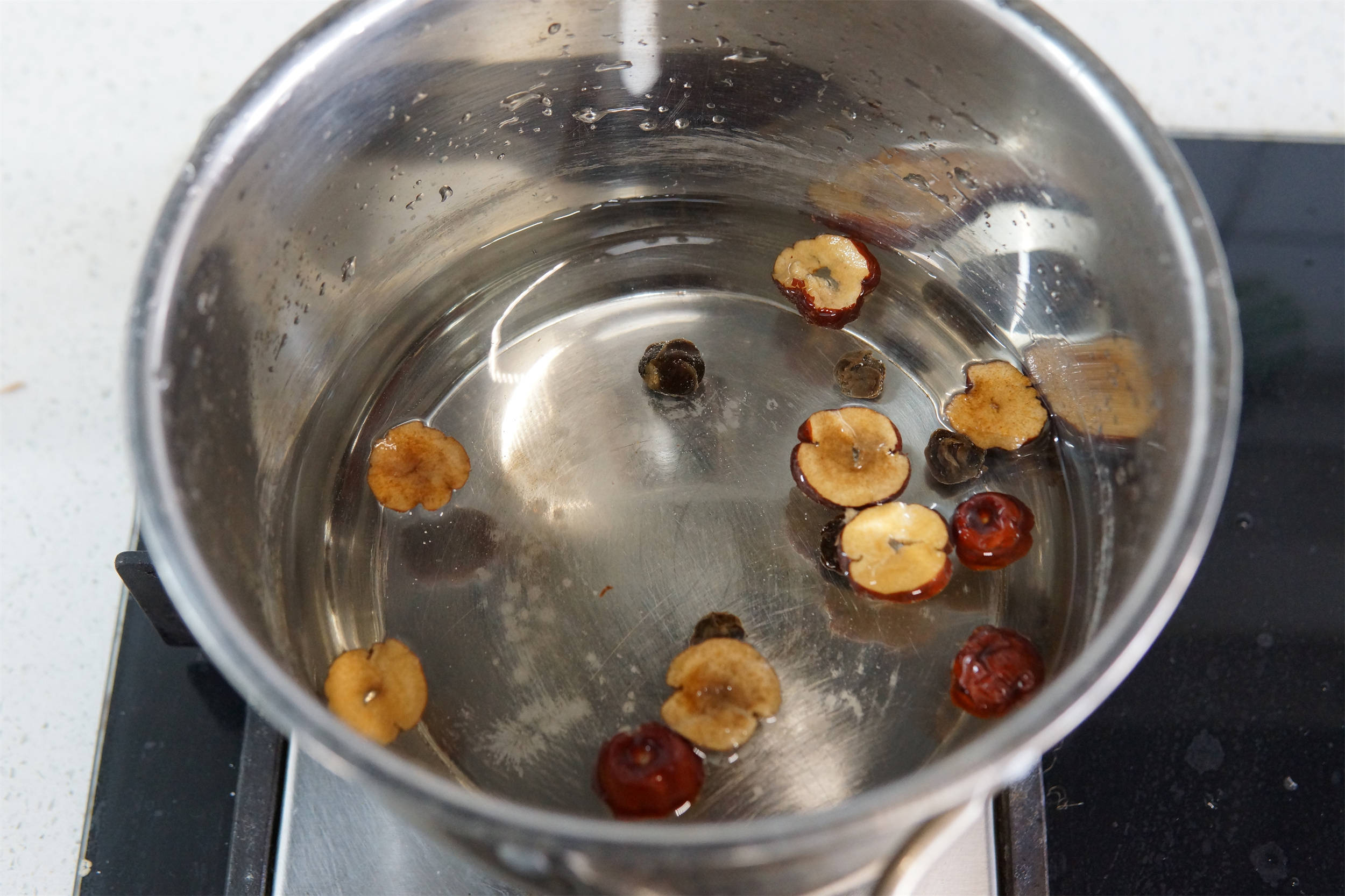 1、桂圆去掉外壳,红枣洗净切片,都放入煮锅中,大火煮10分钟左右。