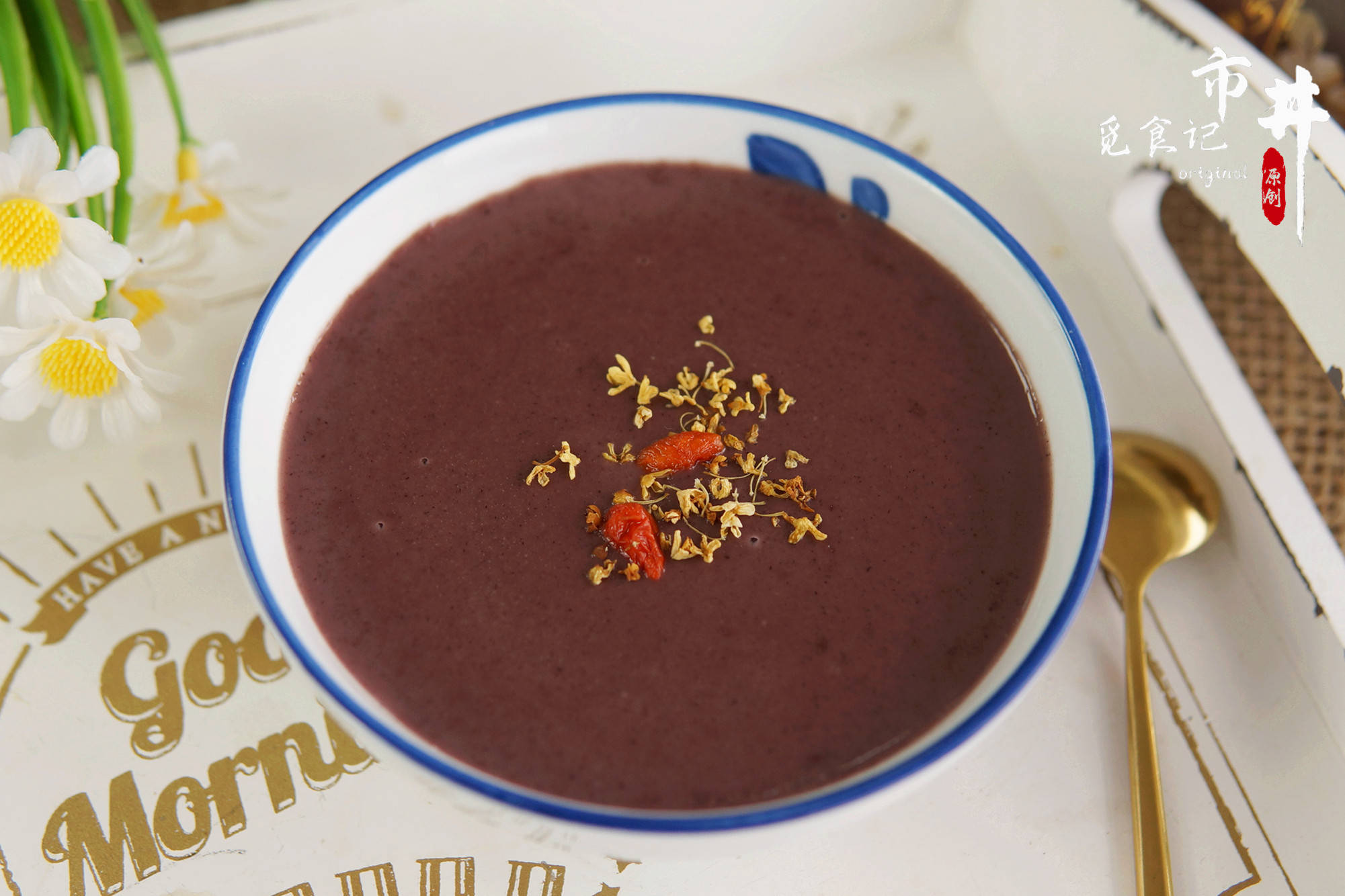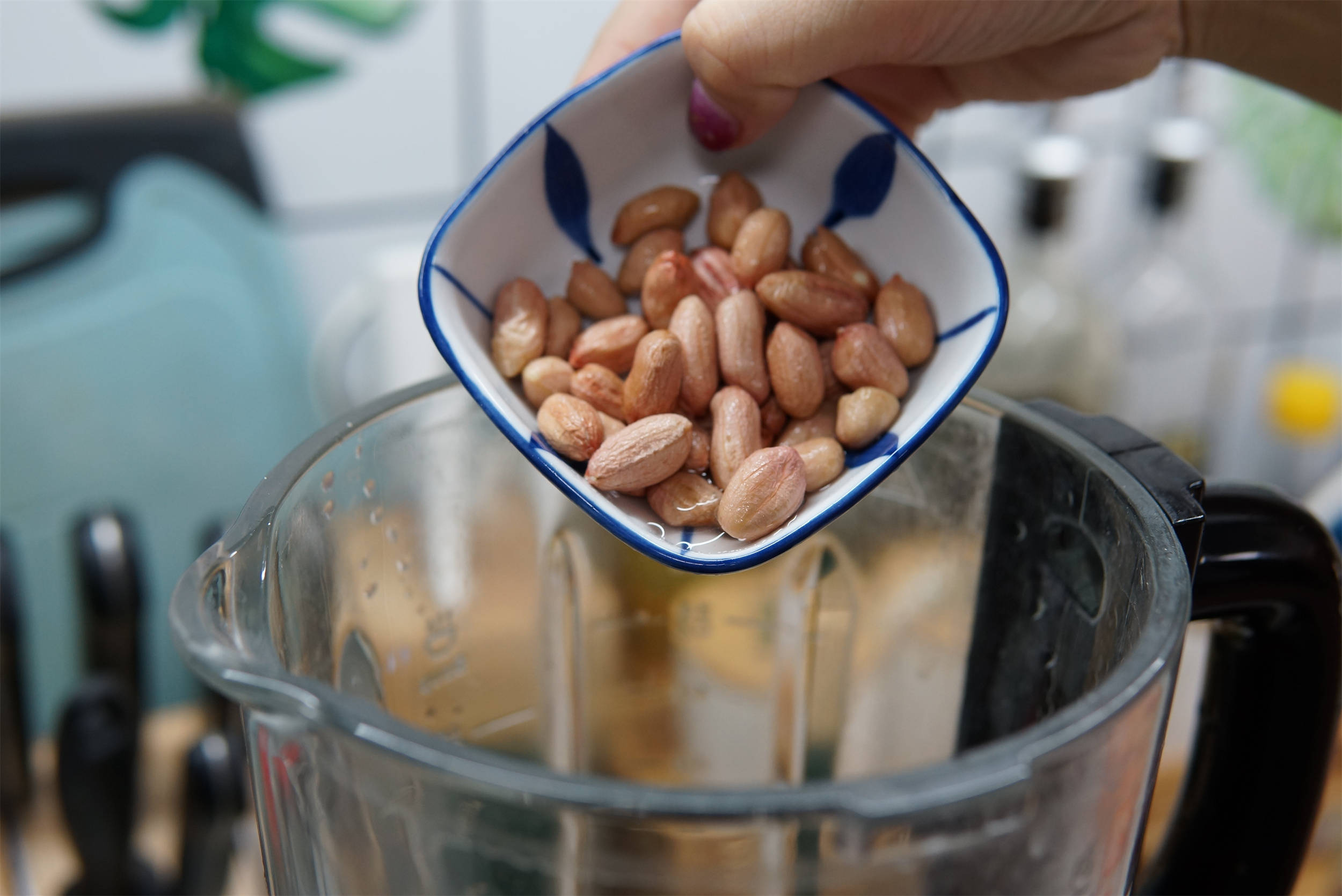 2、芋头与紫米、花生一同放入料理机中,倒入适量的水,按米糊键开启料理机。