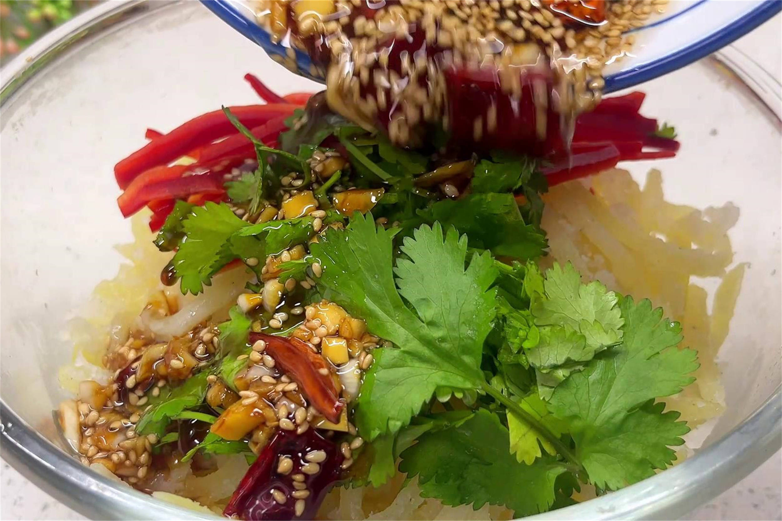 5、土豆丝蒸好后取出,趁热抖散,放入碗中加入红椒丝和香菜碎,倒入料汁就可以了。