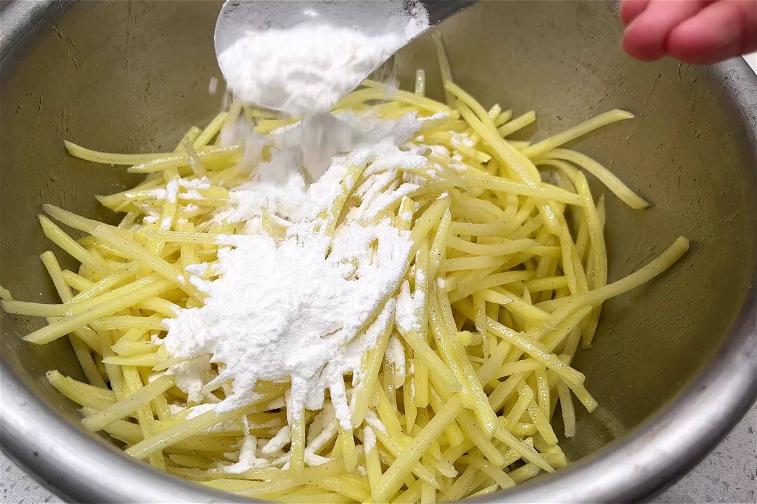 2、土豆丝控干后倒入适量的盐、白胡椒粉和2勺油,抓拌均匀后少量多次的倒入淀粉,再次抓拌均匀,让土豆表面都裹上淀粉。