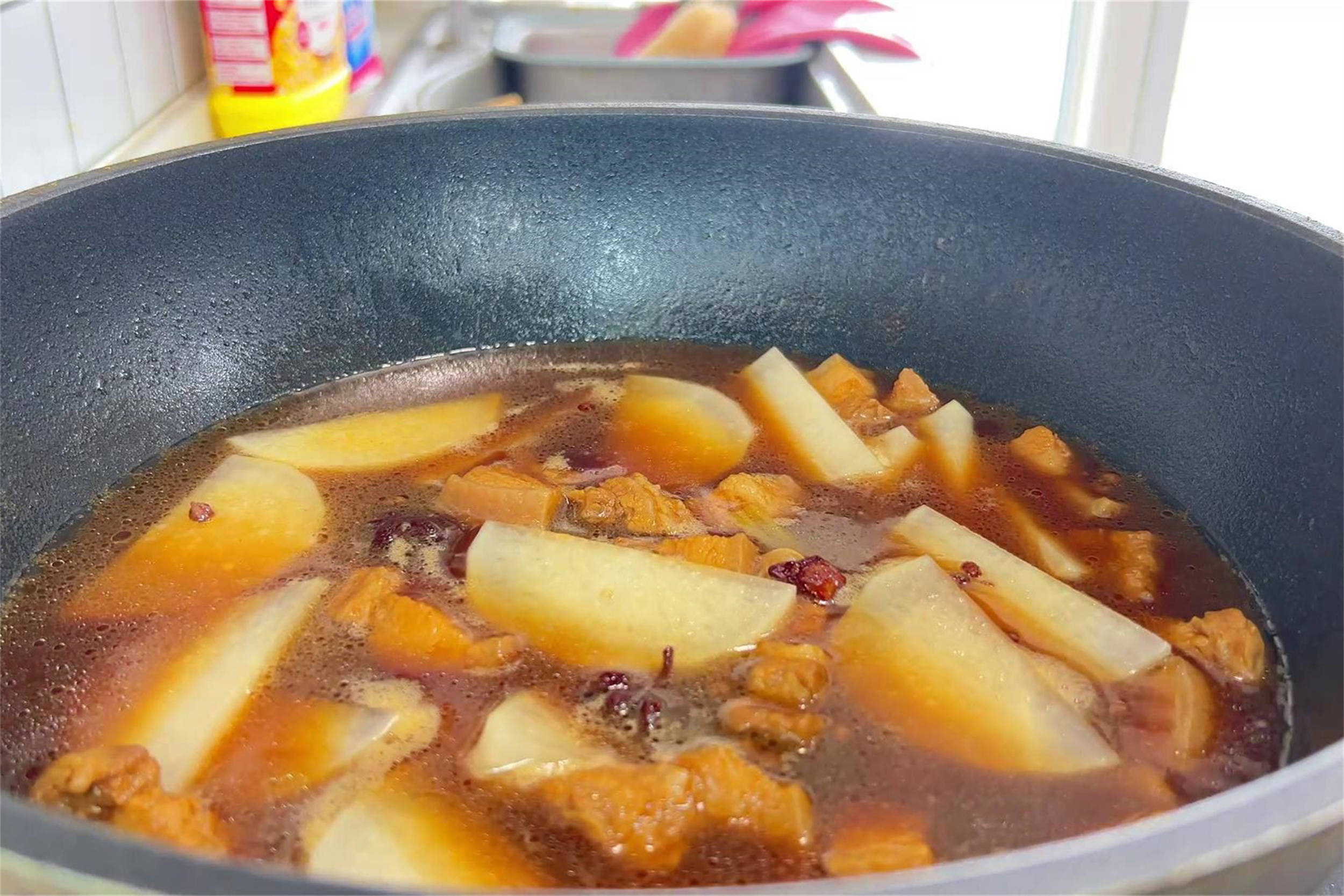 3、白萝卜洗净去皮,切片放入锅中,炖煮20分钟。