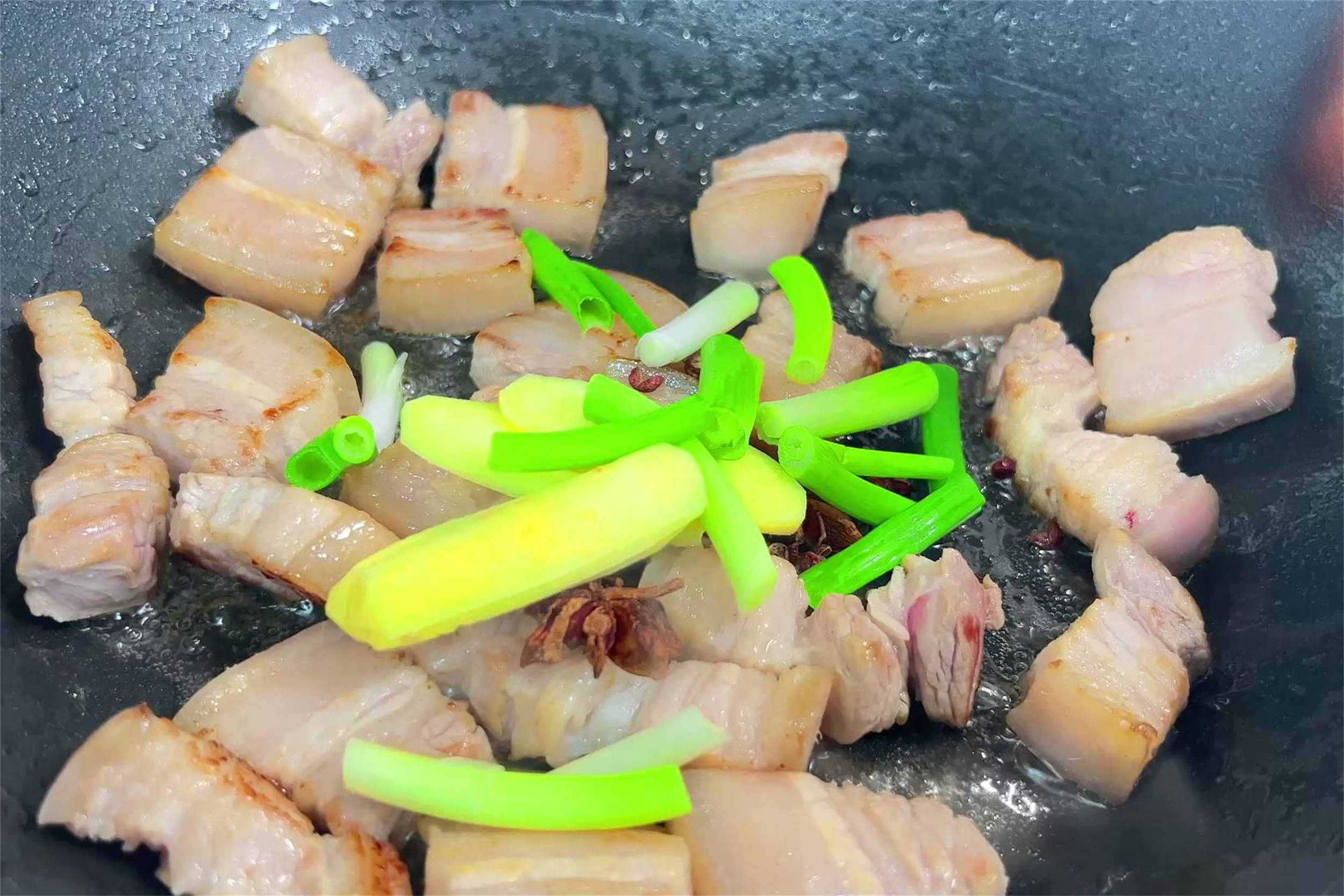 1、五花肉洗净切成小块,锅中倒入少量的油,加热后倒入五花肉片,翻炒出部分油脂,加入姜片、葱段、花椒和八角翻炒出香味。