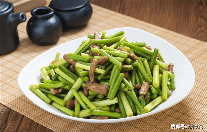肉丝变色即倒入蒜黄,不要久炒,以防水分流失太多,口感变干变硬。
