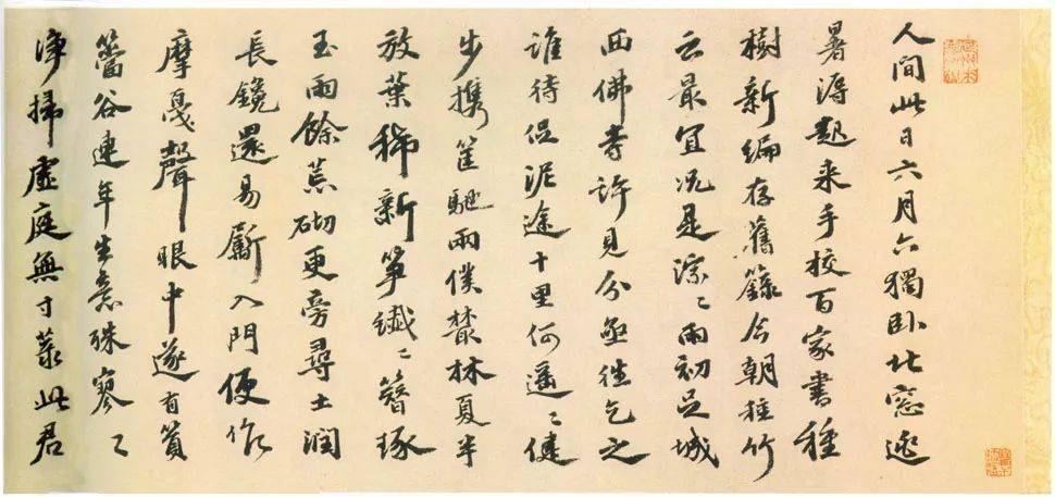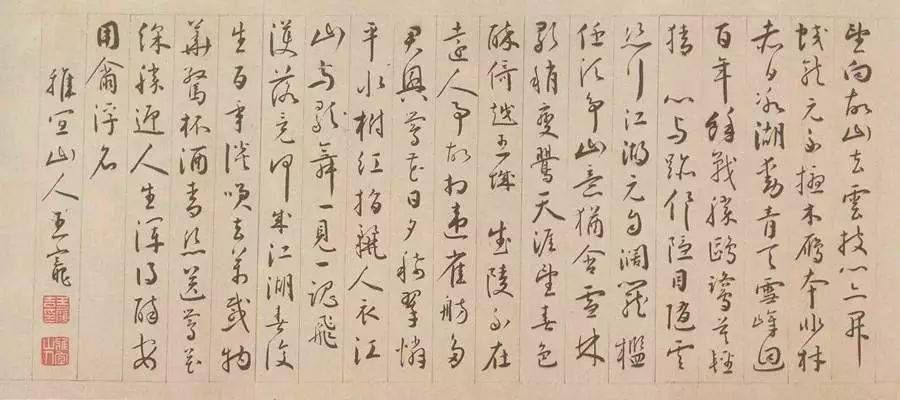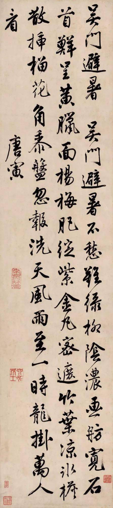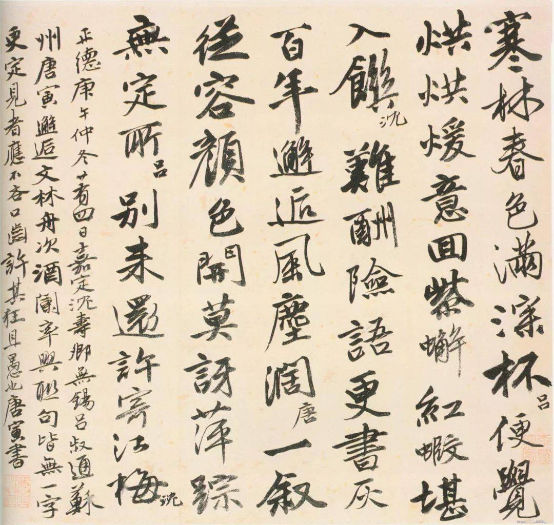 唐寅的书法不及绘画、诗文出名,但天分也极高。他的书法主要学赵孟頫,更受李北海影响,俊逸挺秀,妩媚多姿,行笔圆熟而洒脱,唯笔力稍弱,钩挑牵丝绵软,结构亦略趋松散。故王世贞在《弇州山人稿》中评议:“伯虎书入吴兴堂庑,差薄弱耳。”其实,唐寅的书法与绘画一样,均注意广涉诸家、融会贯通,面貌也很多样,只是享年不永,尚未达到“通会之际,人书俱老”之境界。