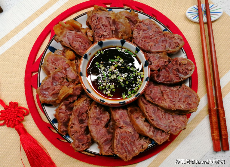 煮好后关火,浸泡四五个小时。最后切片装盘,再调份料汁,就可以上桌了。