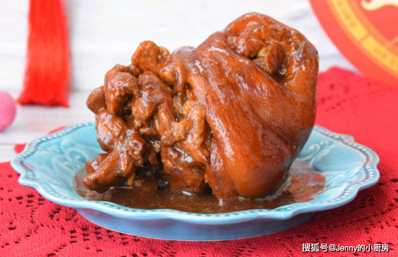 最后将浓稠的汤汁浇在肘子上,就可以端上桌了。想要节约时间,可以用高压锅。
