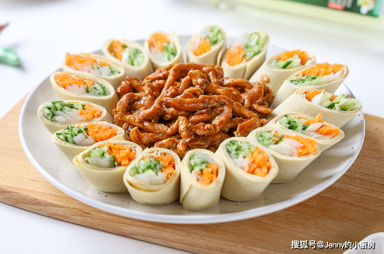 盘内放入豆皮卷围一圈,中间盛入肉丝,就可以上桌了。