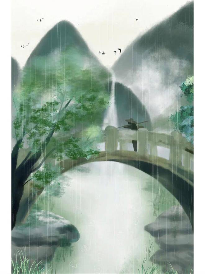 春雨缠绵,断桥难行,行人无法通过,此刻,一叶扁舟悠悠荡出柳荫,带来另一番春意盎然的景象。