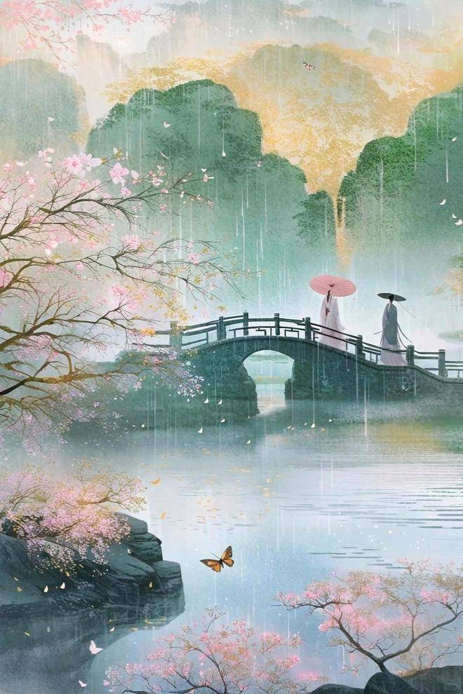 空气中弥漫着淡淡的寒意,细雨如梨花般飘落,仿佛冻结的香气在空中缓缓弥漫。
