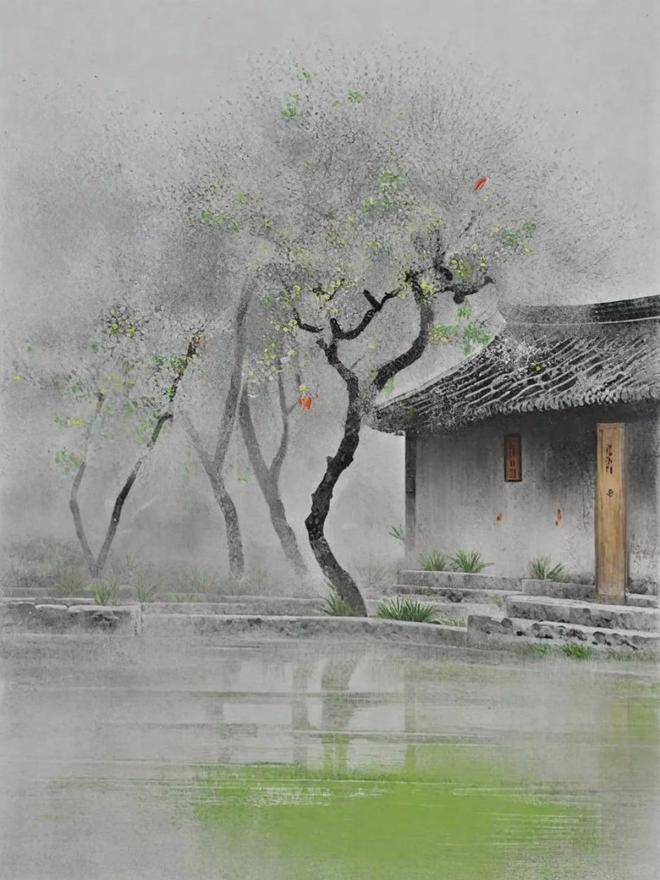 透过窗户,看见斑鸠在细雨中飞翔,几片闲田泛着波纹,隔着水面,农民正握紧春锄,耕耘着新的希望。