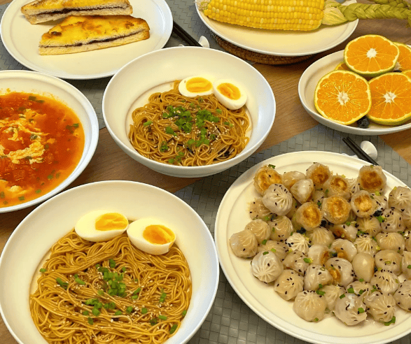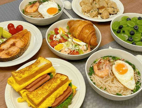 鸡蛋煮挂面色香味俱佳,鸡蛋的鲜香与挂面的滑爽完美融合,煎鱼排外酥里嫩,三明治则选用了新鲜的吐司、火腿、生菜和奶酪,每一口都是满满的幸福感,除此之外还有蒸饺,还有水果蓝莓和青提。