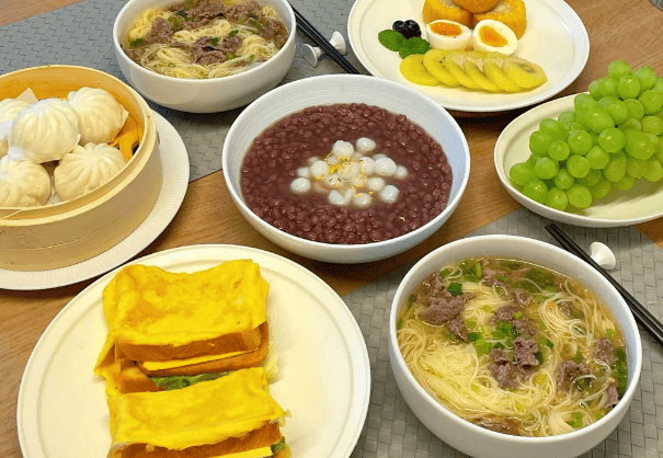 今天的早餐是牛肉面、鸡蛋三明治和猪肉馅包子。牛肉面中的牛肉炖得软烂入味,面条筋道爽滑,汤底浓郁鲜美,让人吃得心满意足,鸡蛋三明治则选用了新鲜的鸡蛋和吐司,再搭配上生菜和芝士片,口感清新爽口,猪肉馅包子皮薄馅足,猪肉鲜嫩多汁,非常满足,今天的水果更是给力,一大串青提和迷糊桃,既补充了维生素又满足了食欲。