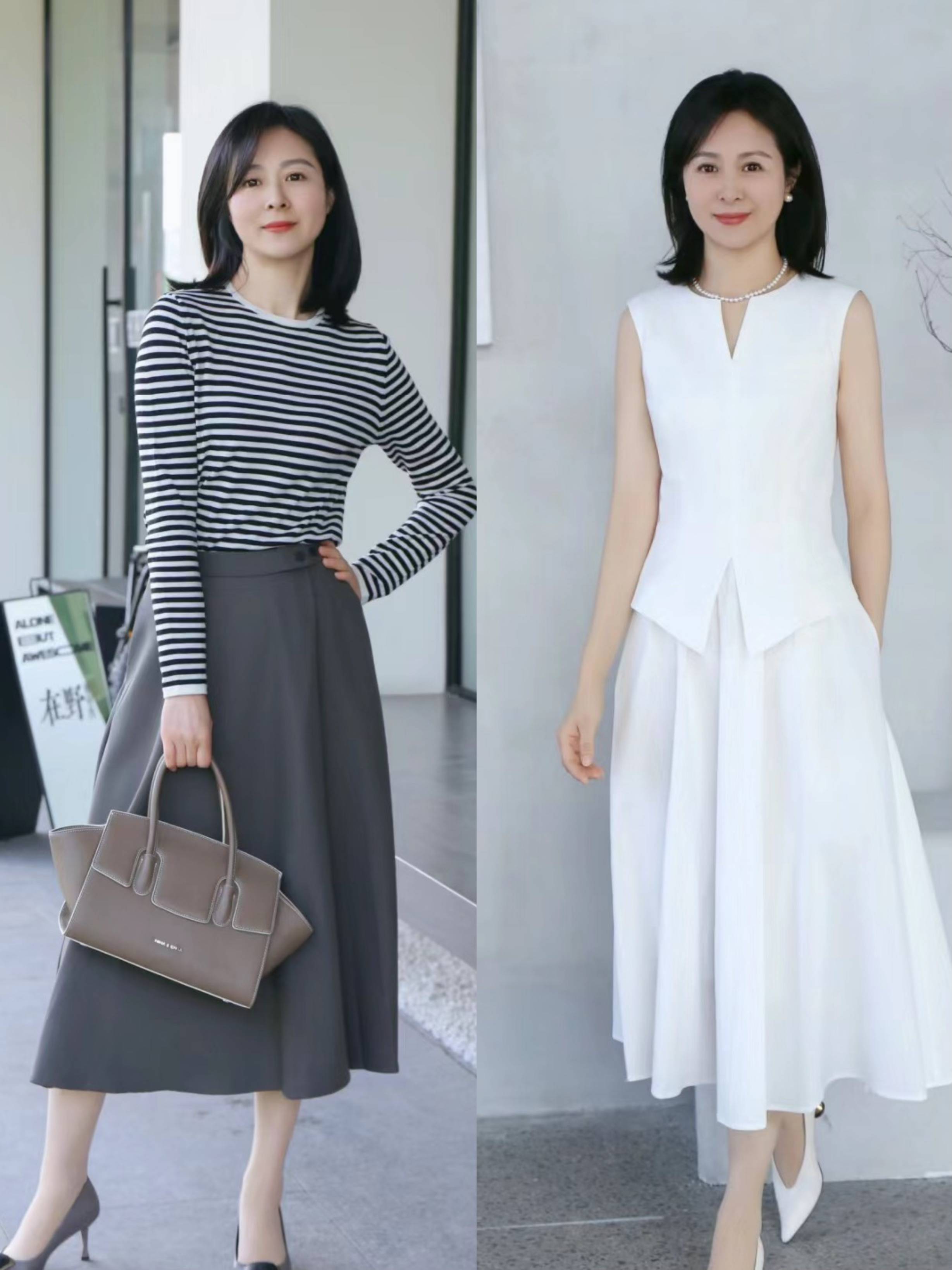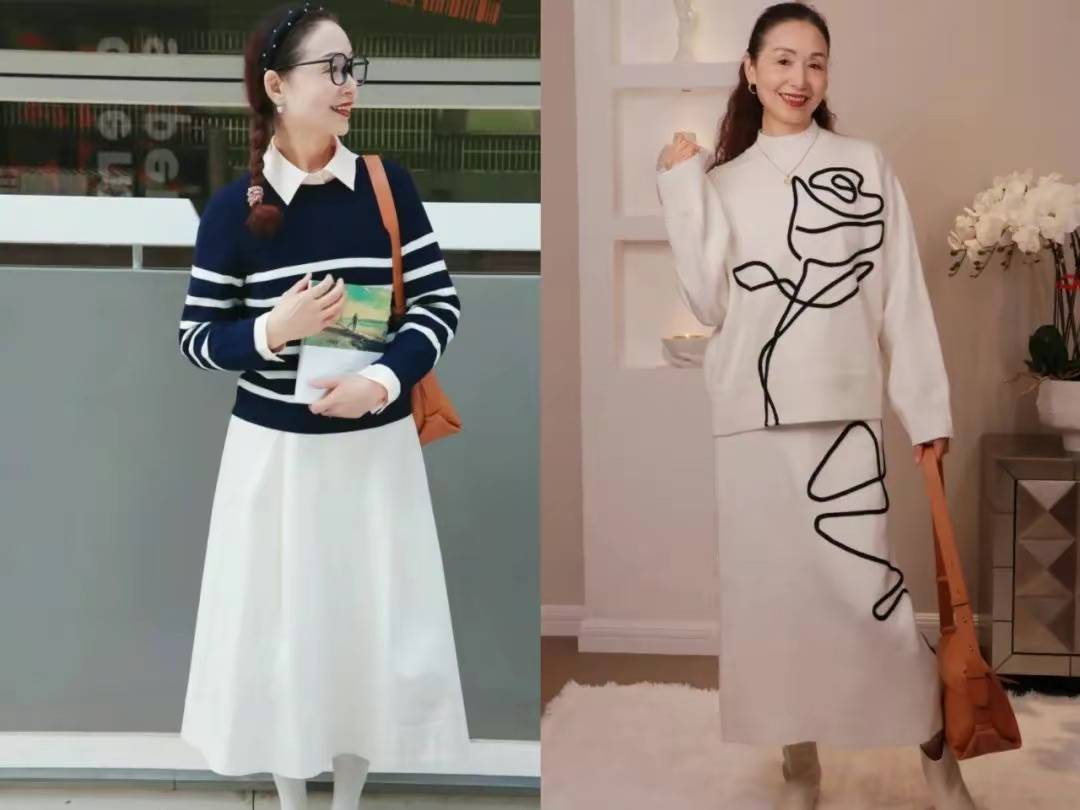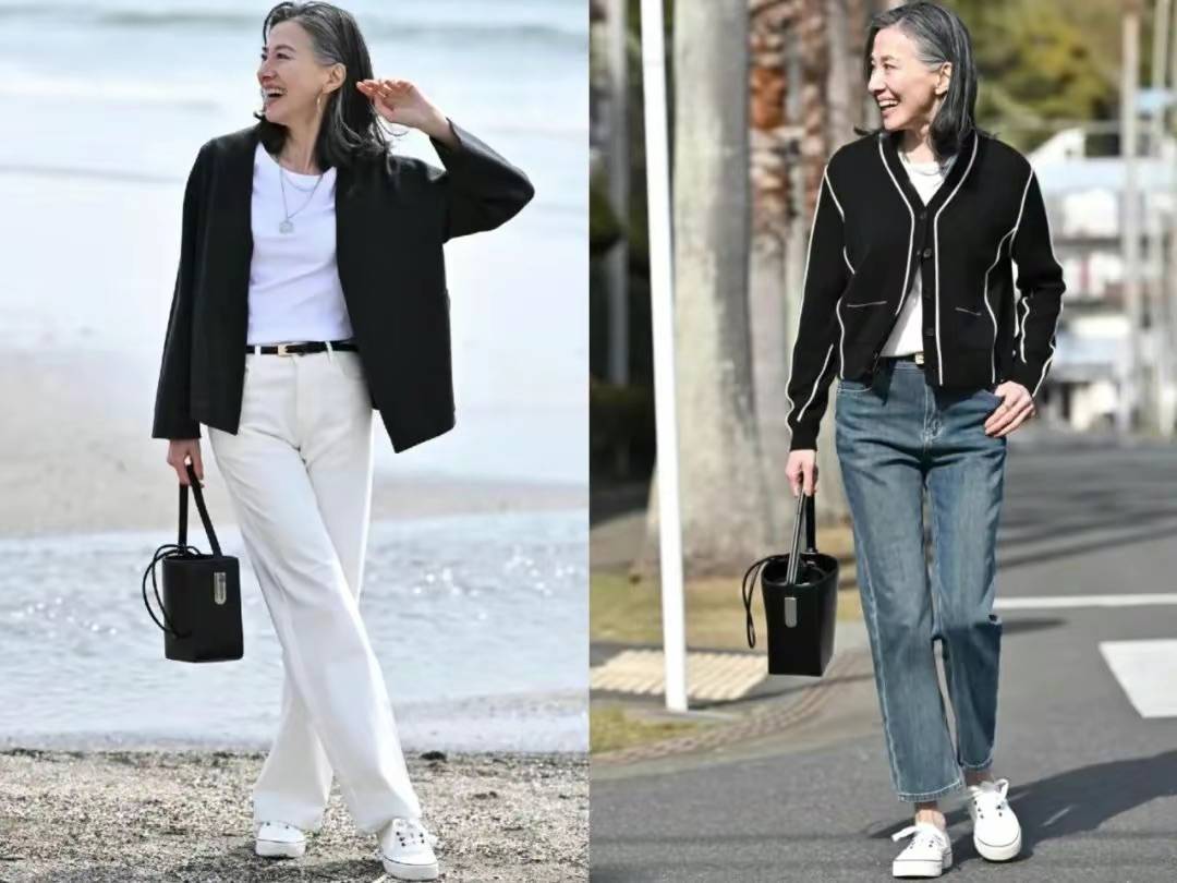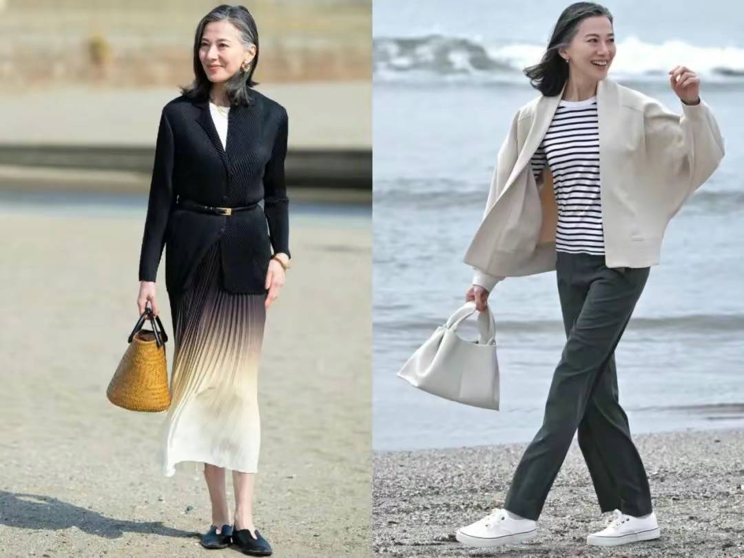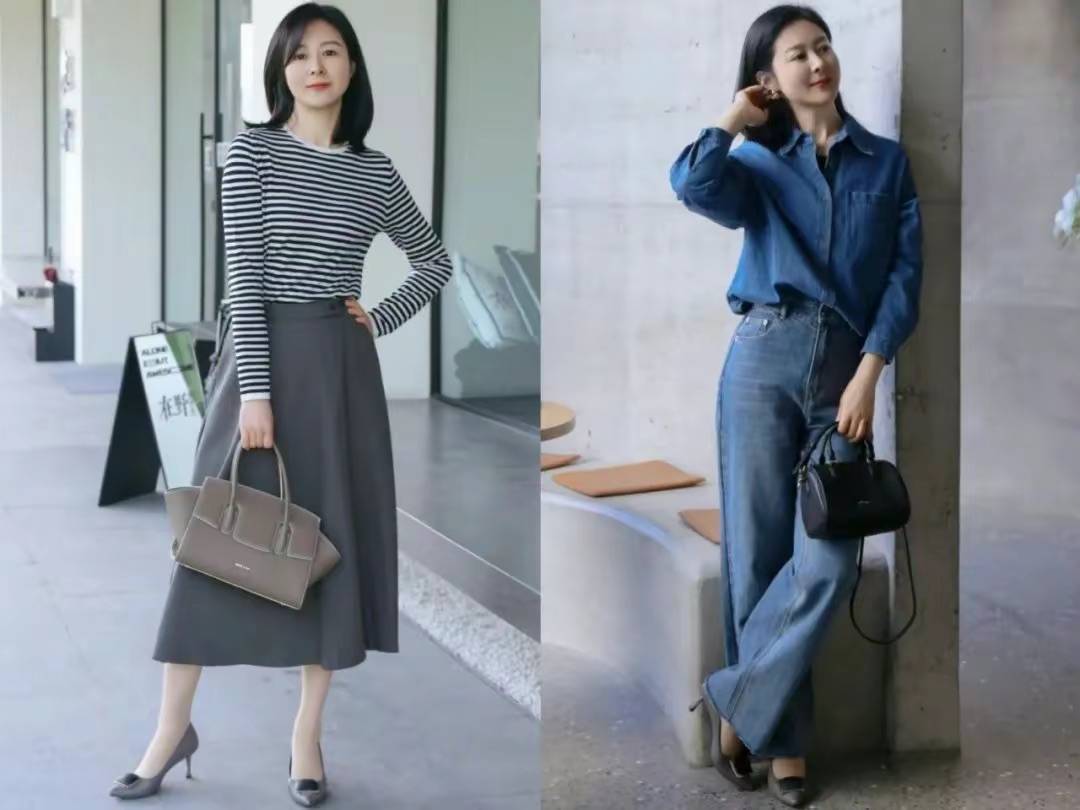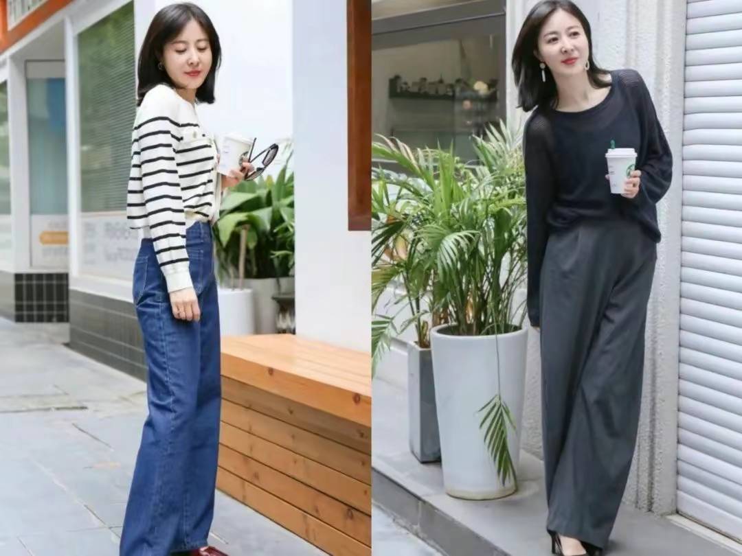 利用休闲风、无龄感服装来弱化年龄感,避免大妈感的呈现,也是一种最简单直观的方式。比如条纹针织衫、直筒牛仔裤、西装阔腿裤都是比较常见的单品。