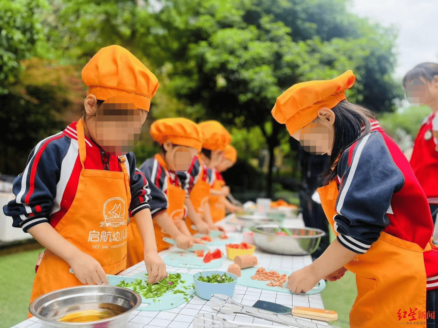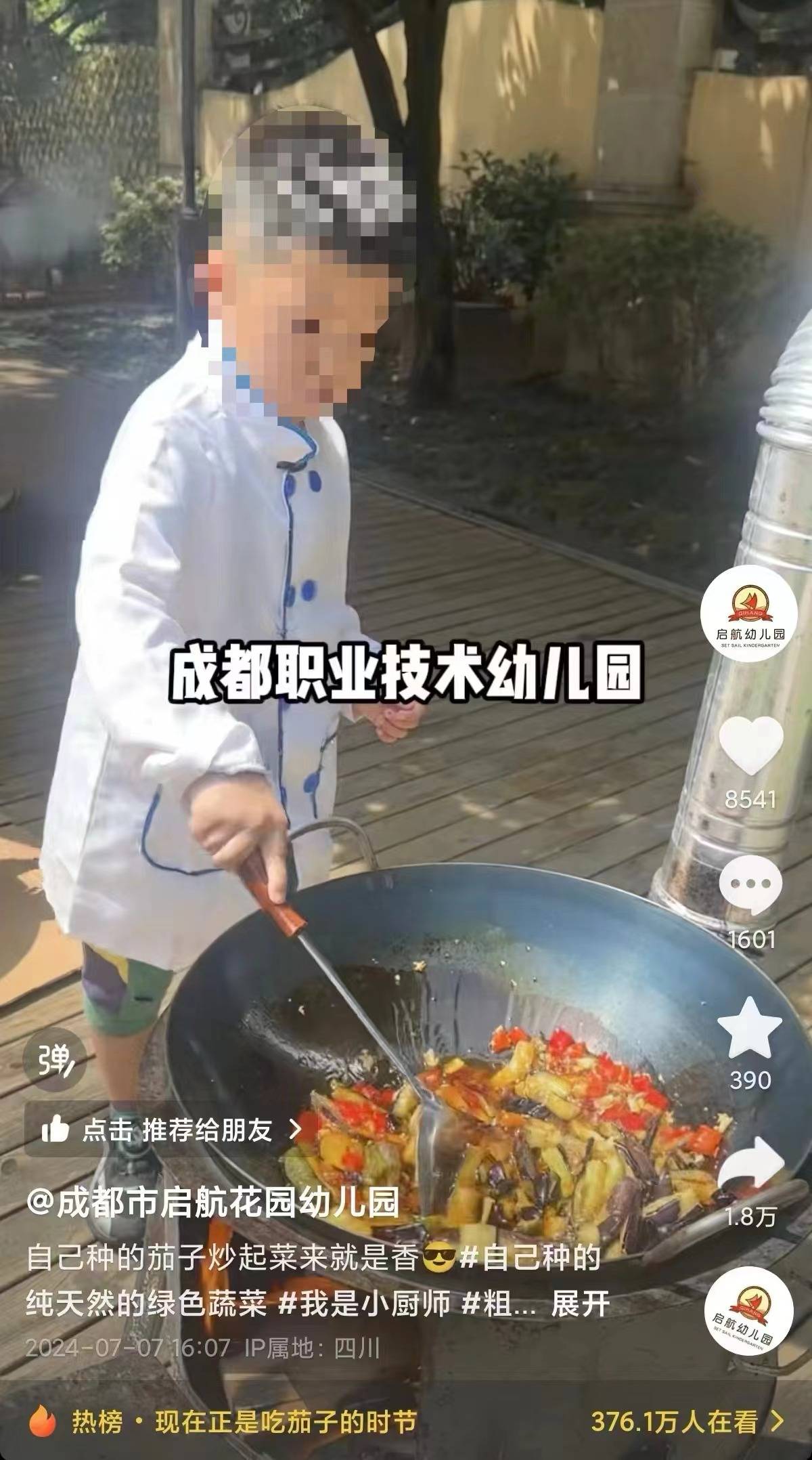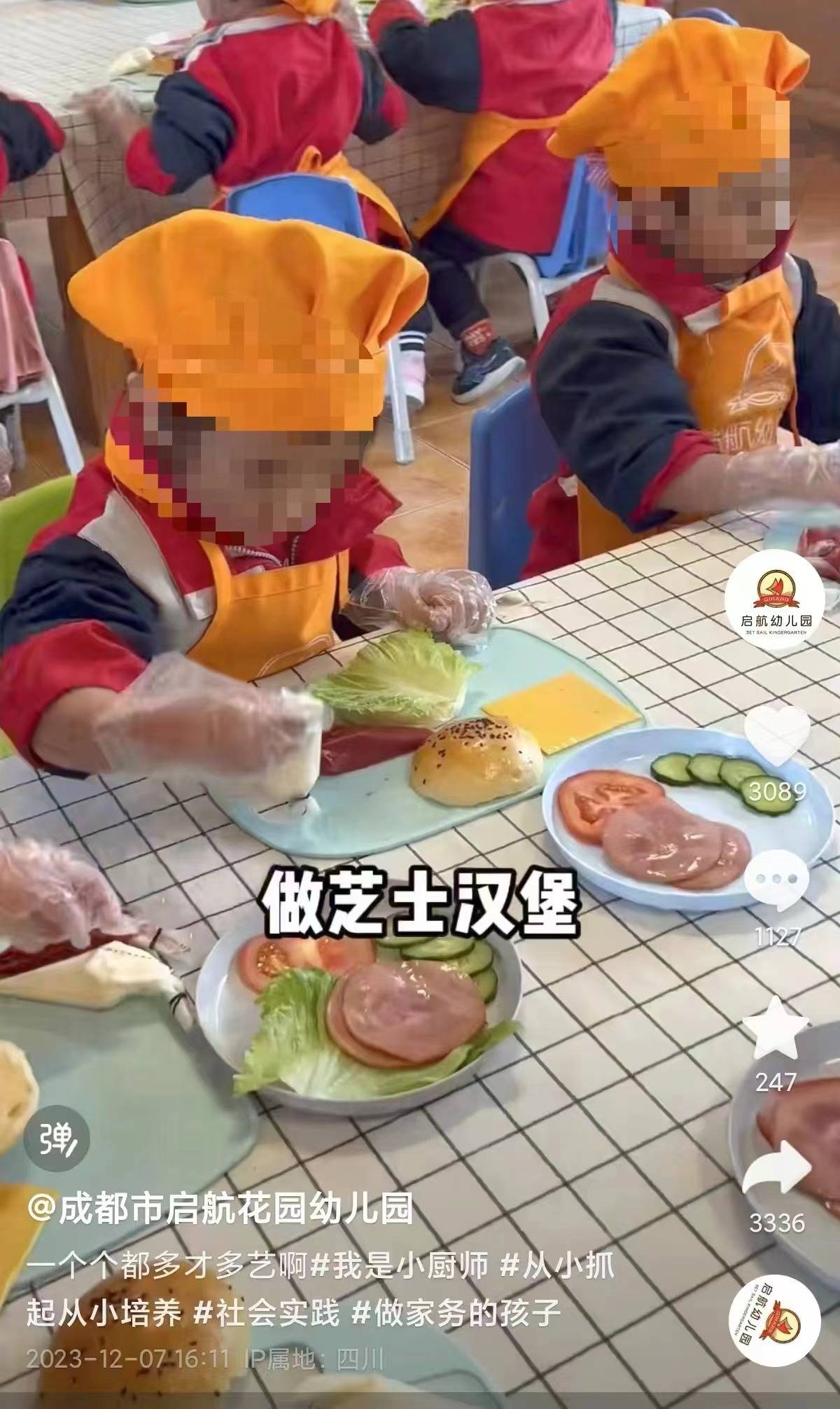 戴上手套,熟练地抄起锅铲,先下油、蒜、花椒,倒入小龙虾,翻炒之间,青色的小龙虾逐渐变红,香气扑鼻而来。你相信吗?这道麻辣鲜香的蒜香小龙虾,出自一群五六岁的“小孩哥”“小孩姐”之手。近日,位于成都市郫都区的成都市启航花园幼儿园(以下简称“启航花园幼儿园”)在社交媒体上火了,被网友戏称为“职业技术幼儿园”。幼儿园发布的短视频中,孩子们戴上厨师帽、穿上围裙,洗菜做饭、喂鸡养兔,甚至刺绣编织,稚嫩的面庞与熟练的动作形成鲜明对比,俨然“小大人”模样。不少网友评论:“孩子的手艺,可以直接出摊了。”