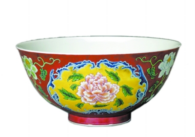 胭脂红地珐琅彩开光折枝牡丹纹碗