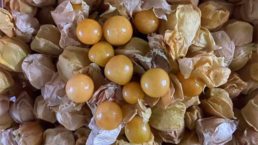 家菇娘一般都是黄色,这种菇娘成熟后表皮发亮,口味酸甜可口,是连籽一起吃的,非常的过瘾。而野菇娘一般是红色的,颜色很漂亮,也很喜庆,就像一个新娘披着婚纱,但是口味略微有些苦。