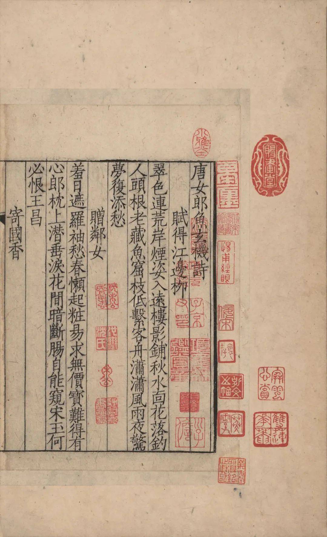 《鱼玄机诗》,南宋临安陈氏书籍铺刊本。鱼玄机(844—871),唐陕西西安人,貌美而好书。此集版本存其诗四十九首、十二叶,是目前收录其诗最齐且刊印最早的本子。该本开眼所见,字体即属宋代杭州地区风格,亦曾是黄丕烈旧藏,黄氏并将之改为蝶装,传历至今,黄跋云:“既而五柳主人云有《鱼玄机集》,亦宋本也。余闻其名,急欲一睹,适五柳主人出吊海宁,迁延不获见所谓《鱼玄机》者,方怅然若有所失,忽从他处遇之,即此《唐女郎鱼玄机诗集》也。书仅十二叶耳,索白银八金……”(见《黄丕烈藏书题跋集》)是书民国间归袁克文,时或有翻刻,其原本今归中国国家图书馆。其书凡见题字者28人,钤印亦有128方之多。有关鱼玄机诗集故实,可参见张波所著《〈唐女郎鱼玄机诗〉史话》。