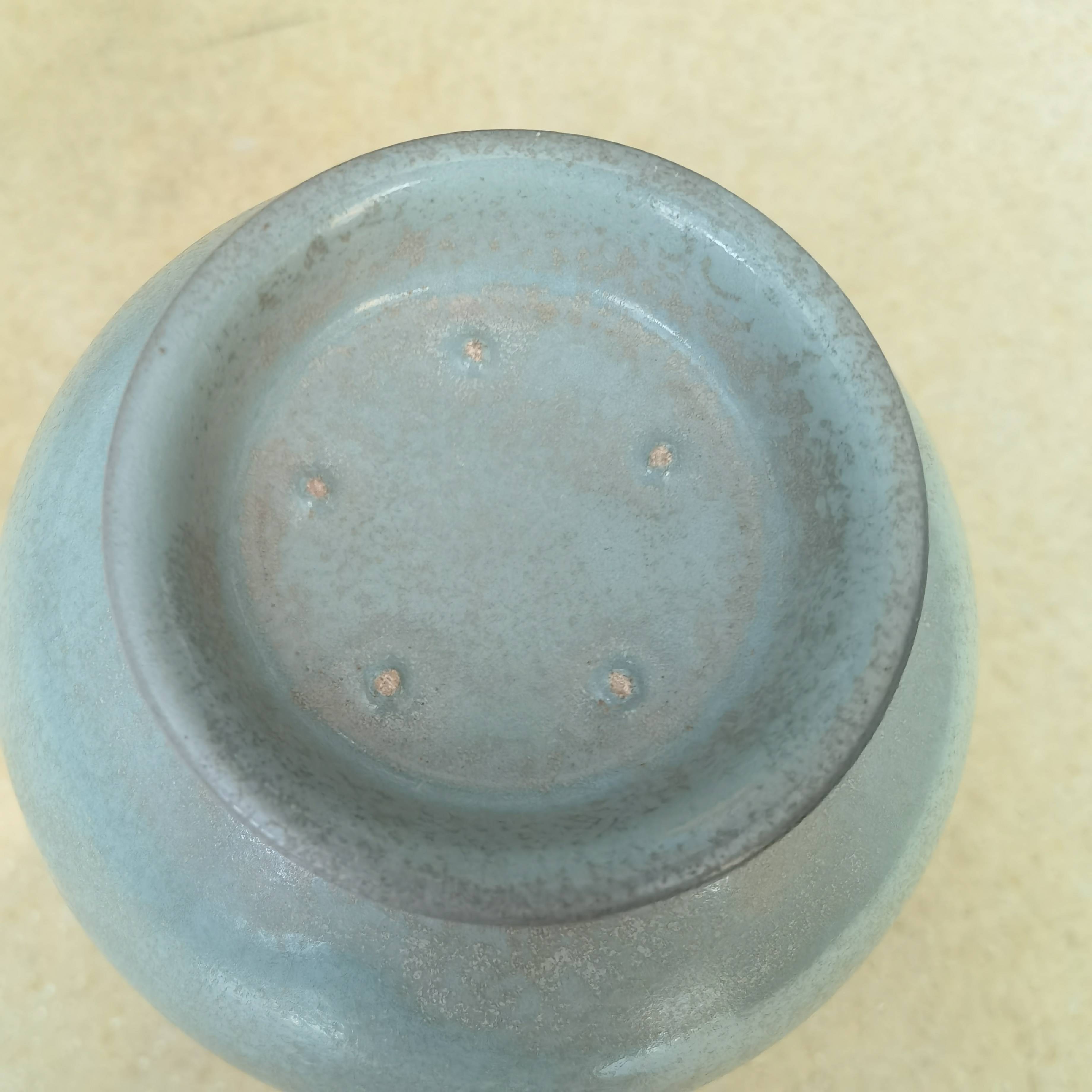 此外,汝窑瓷器多采用满釉“裹足支烧”的技法,即在器物底部以支钉隔开瓷胎和匣钵,支钉细小如芝麻粒,烧成后器物外底会留下细小的支钉痕迹,称为“芝麻钉”,这是汝窑瓷器的重要特征之一。支钉数量因瓷器的器形和大小不同,数量一般为三至五个不等。椭圆形水仙盆等特殊器型则因支烧需要留有六个支钉痕。