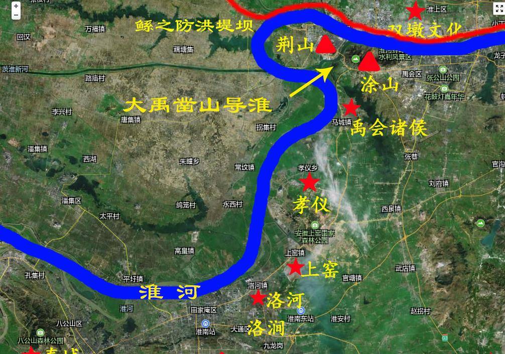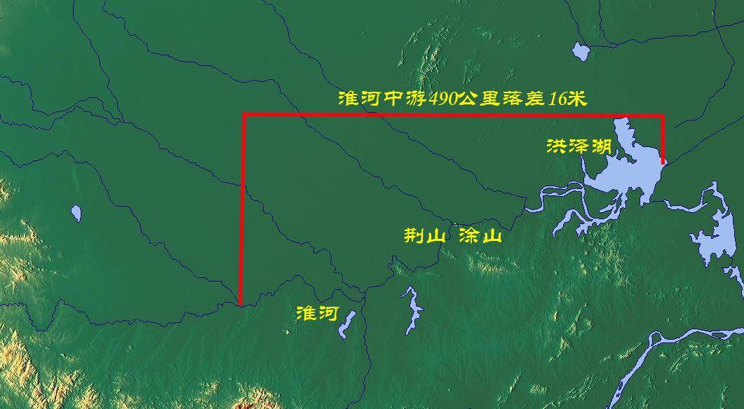 在尧舜禹时期,每到夏历的夏四、五、六月份,南北暖湿季风在淮河沿线交汇,形成连续多日的阴雨天气,大雨、暴雨连续出现,使得淮河沿岸洪水成灾。以涂山为中心的淮河中游490公里流域,淮河水位差只有16米。在夏季洪水时节,淮河中游16米的水位落差本就很难让淮河上游来水,顺畅东流,当淮水到达荆涂二山地区,受荆涂二山的阻隔,如果抬高16米水位的话,荆涂二山上游二三百公里流域地区将成为一个大湖,成为十年九涝的洪水地区。