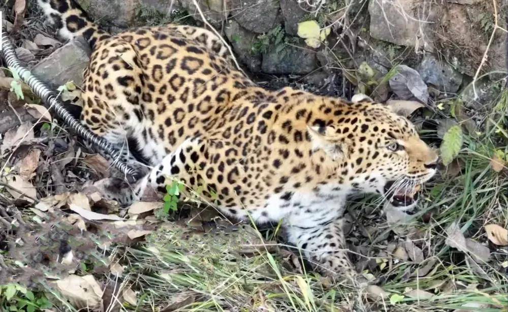 被打趴下的华北豹,往山上逃离,但令人没想到的是,华北豹才走到几十米外的地方,竟踩中了陷阱,被猎套困住,怎么挣扎都挣不脱。