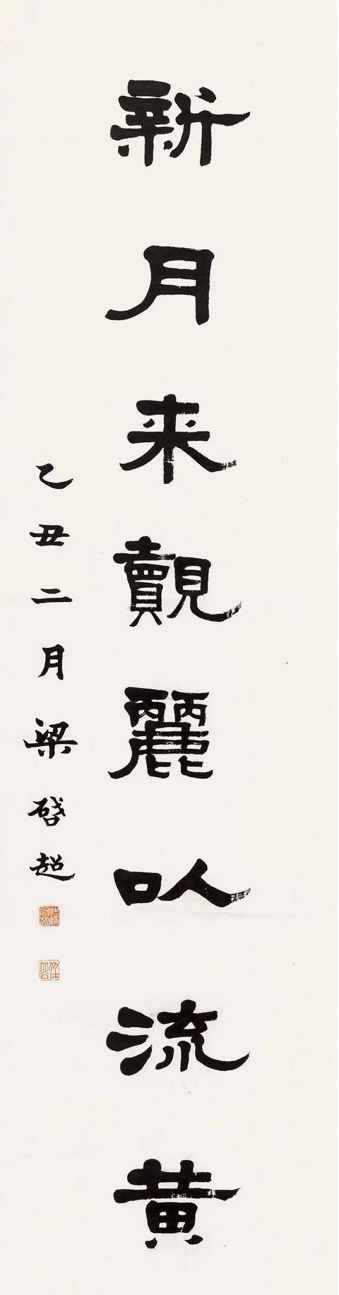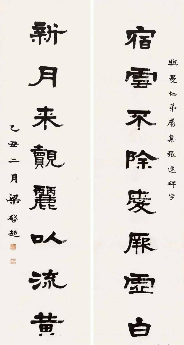 《宿雪新月八言联》是梁启超以隶书创作的一幅对联作品,尺寸为180.5×47.0 cmx2,采用水墨纸本形式,现存的版本上有梁启超的钤印“梁启超”和“任公”,以及题识“与曼仁弟属集张迁碑字。乙丑二月,梁启超”。这幅作品不仅体现了梁启超的书法造诣,也反映了他对古典文学的热爱和传承。