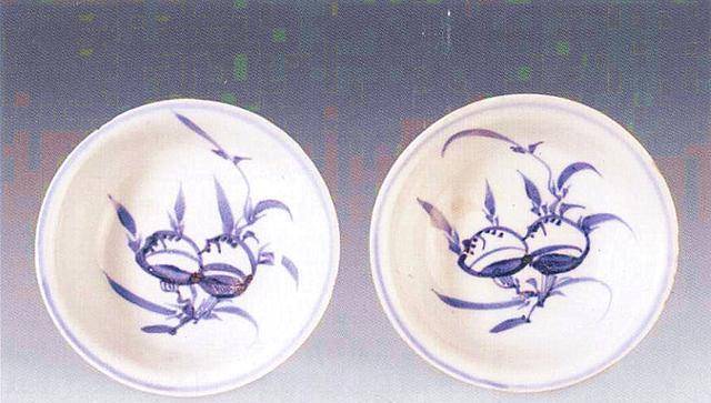 青花桃果枝叶纹碟15件,碟子为外高内低状,底部无釉,粘连少量石英颗粒。底部绘有一组折枝桃果,果实饱满,桃叶细长尖锐。在左侧果实叶脉间,用针刺出一个“姚”字。有青花葡萄纹碟5件,与折枝桃果纹碟类似,底部绘有葡萄纹。