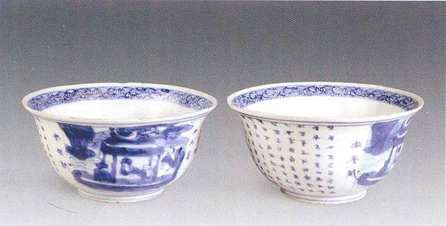 青花“赤壁赋”碗上绘画有山水荡舟图,船上有三个人对坐清谈,船后部有二人摇橹。在图案边上,从左到右题写着苏轼的“后赤壁赋”全文。在小碗底部,有“玉堂佳器”四个字。在四个字的下面,用针刺出了一个“姚”字。可能这批瓷器的主人姓姚,所以刺出了这个字。