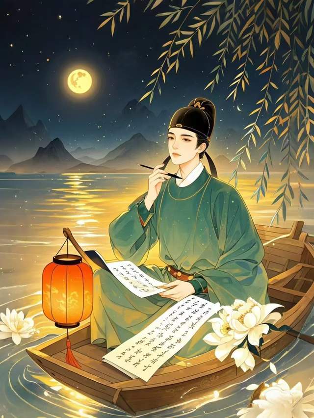 一叶扁舟,悄然划破水面的静谧,载着那满怀思绪的诗人,遁入无垠的江海。