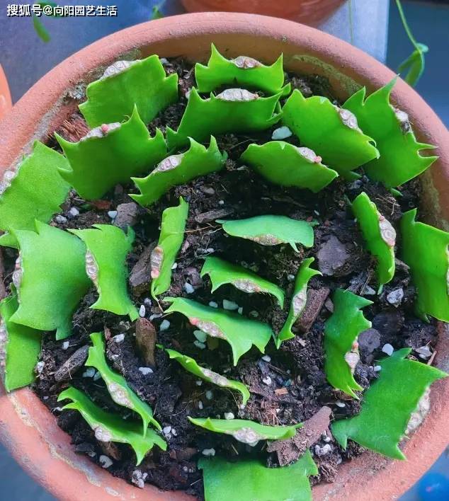 我们从网上或者是从线下的花卉市场所买到的盆栽蟹爪兰,往往都是通过叶片扦插繁殖的,也就是说一个花盆里的蟹爪兰是经过多片叶子扦插养大,买回家之后,你就可以进行重新分盆种植。