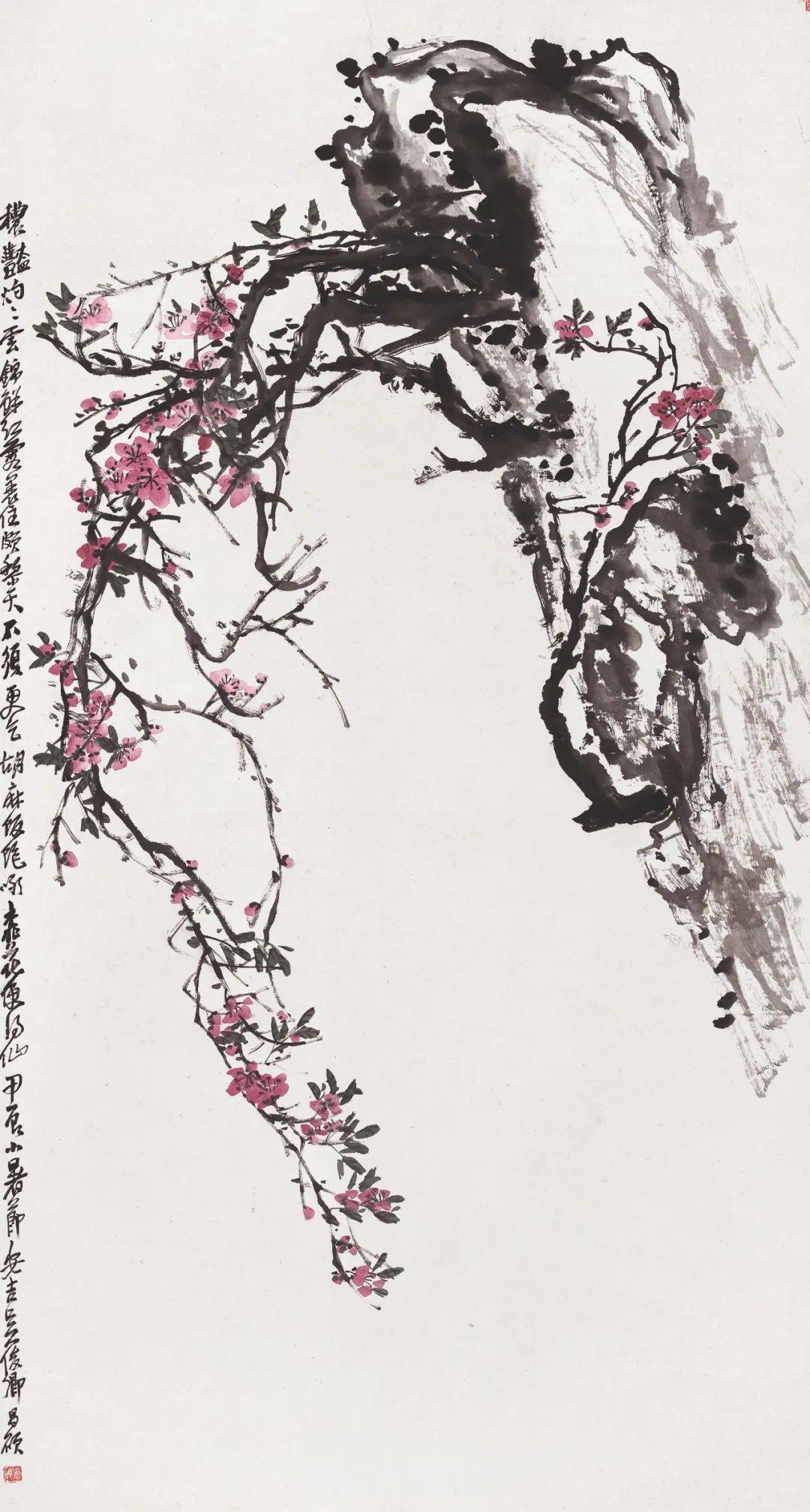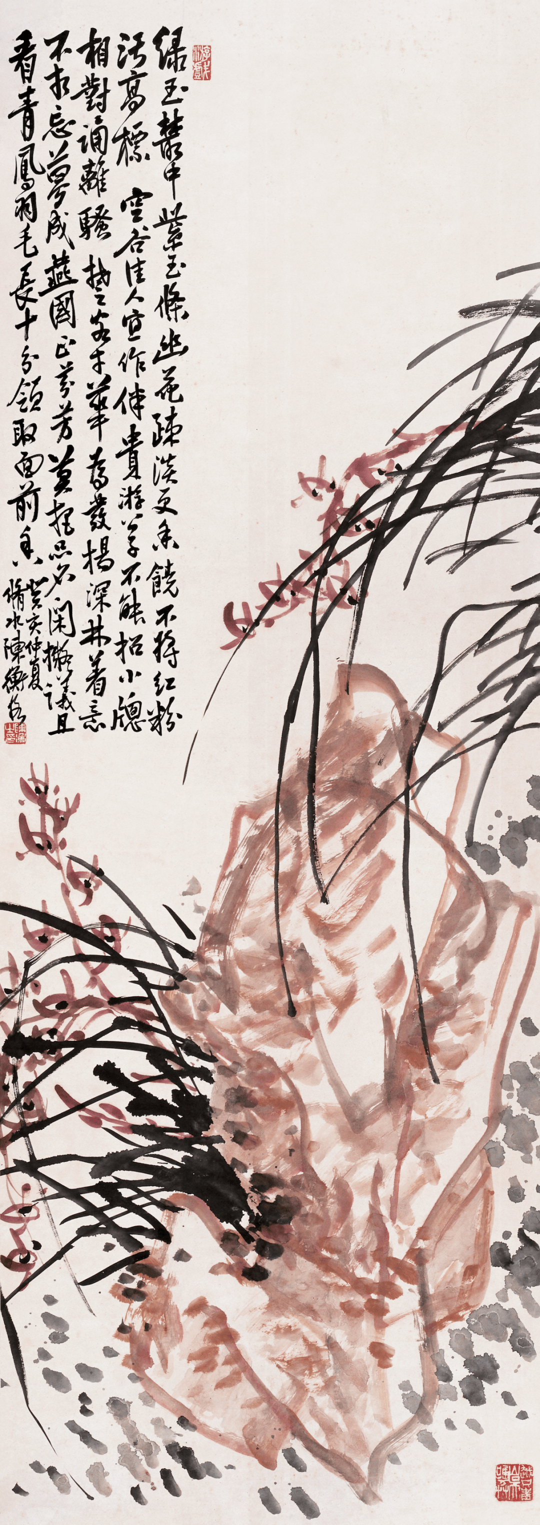 题识:红时槛外春风拂,香处豪端水佩横,富贵神仙浑不羡,自高唯有石先生。庚申十一月,雪窗吴昌硕,年七十七。