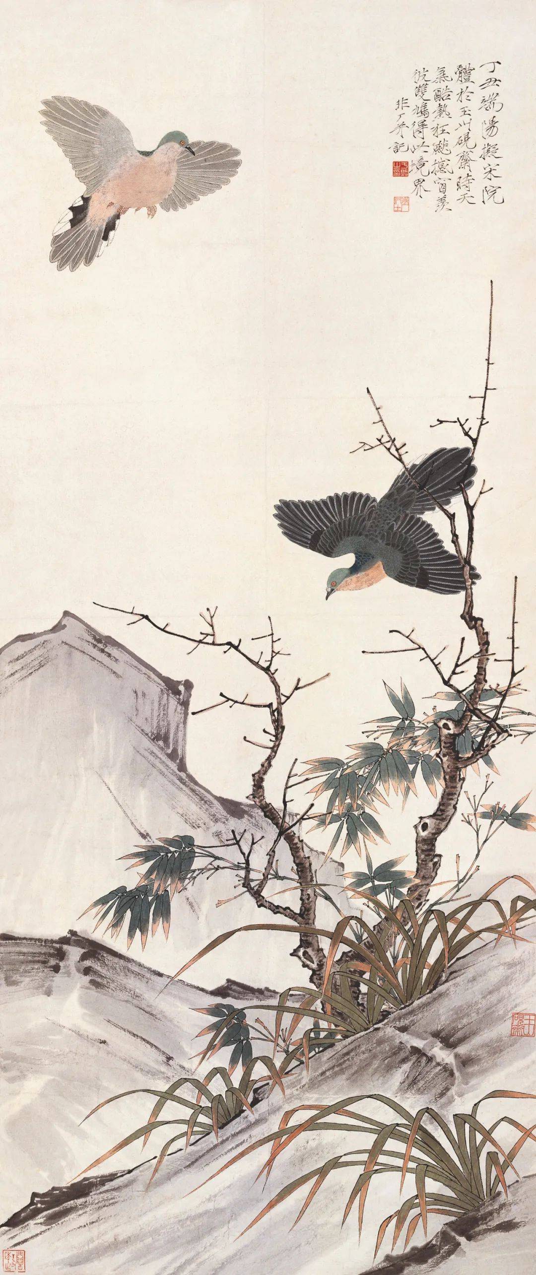 题识:丁丑端阳拟宋院体于玉山砚斋,时天气酷热,狂飙撼窗,羡彼双鸠得此境界,非厂并记。