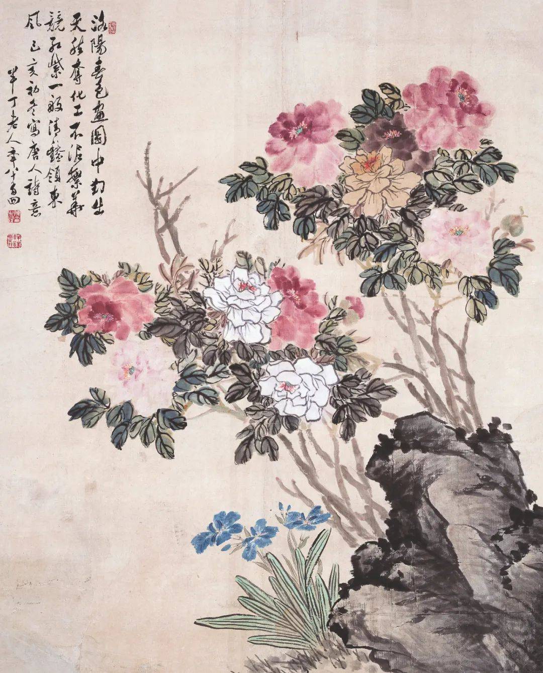 题识:洛阳春色画图中,幻出天然夺化工。不泥繁花竞红紫,一般清艳领东风。己亥初冬写唐人诗意,半丁老人八十有四。