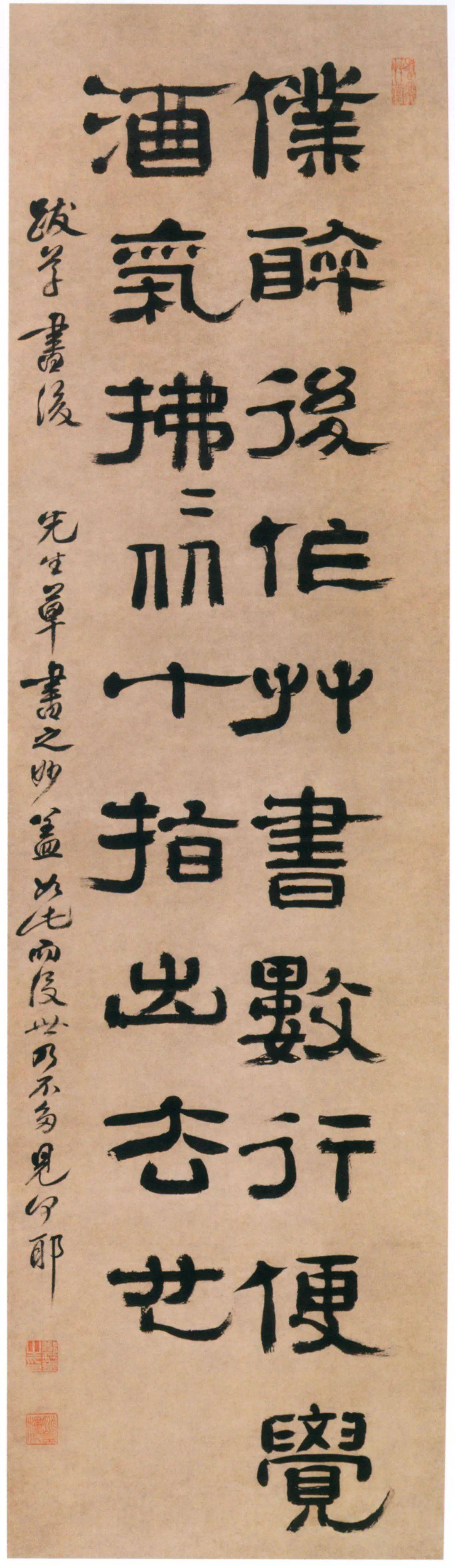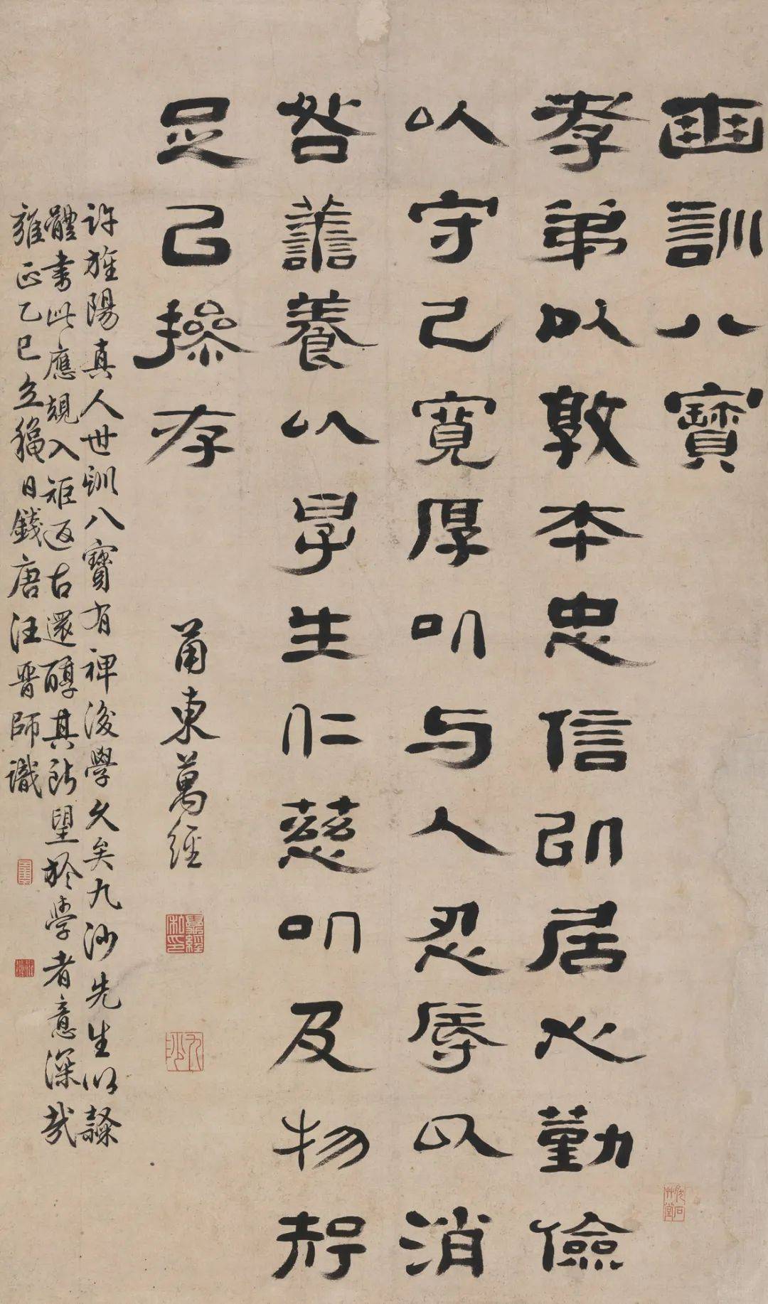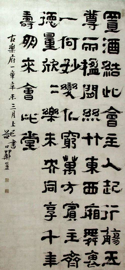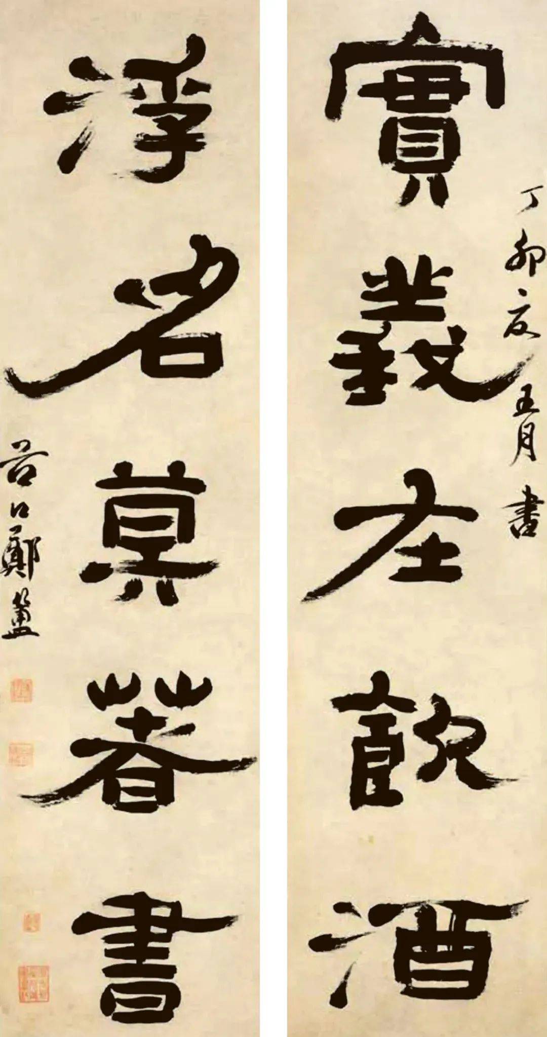 张在辛认为郑簠晚年成熟期的风格是“醇而后肆”,如果没有早年对《曹全碑》那样中规中矩的范本的悉心学习,郑簠晚年的“变奇”根本无从谈起。郑簠曾自言:“《曹全碑》一字一法,一画一法,方长大小,全无定体。非十年功夫不能穷其奥旨”。正因为郑簠借《曹全碑》直入汉碑堂奥,所以他才得以如此自信。与早期临摹汉碑字形、亦步亦趋的作品相较,这时郑簠注重字形的避让、腾挪,注重书写的顿挫、节奏,恣肆挥洒的同时,也着实透露出了几分诙谐与稚拙来,这或许可以看作是郑簠审美思想中的“奇古”。