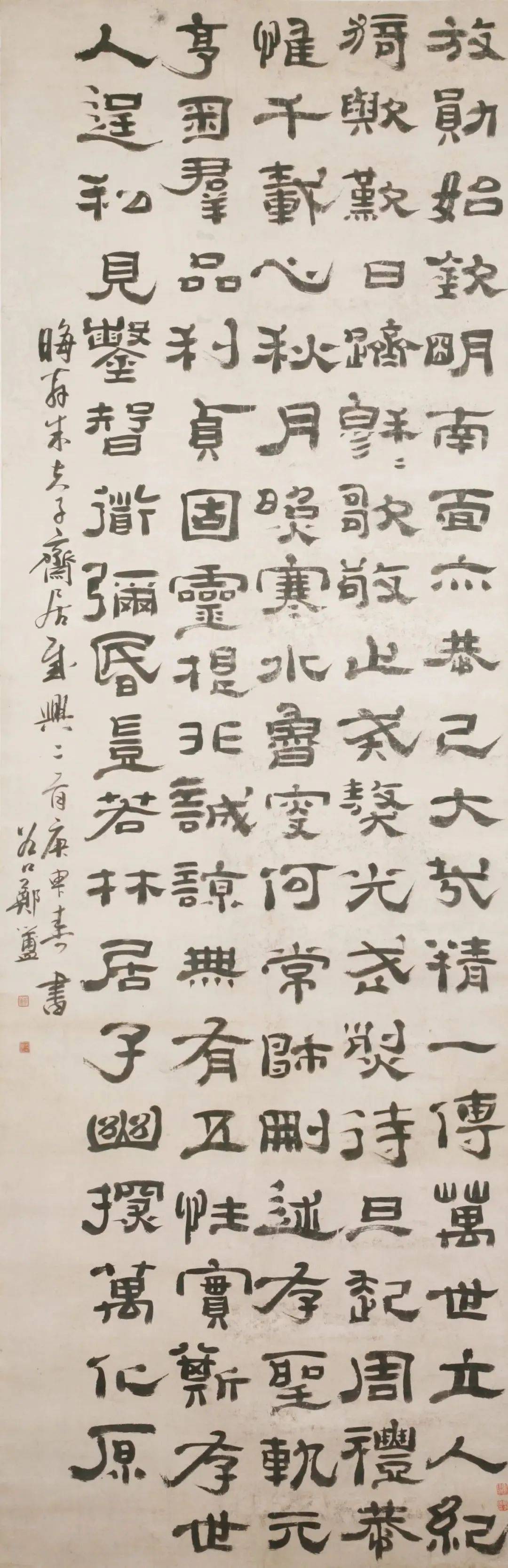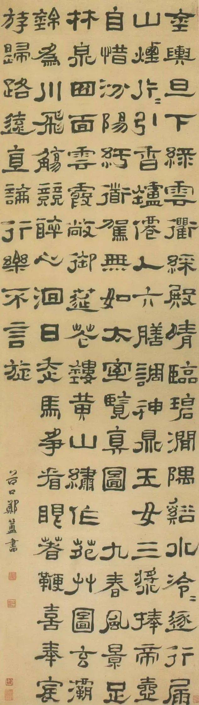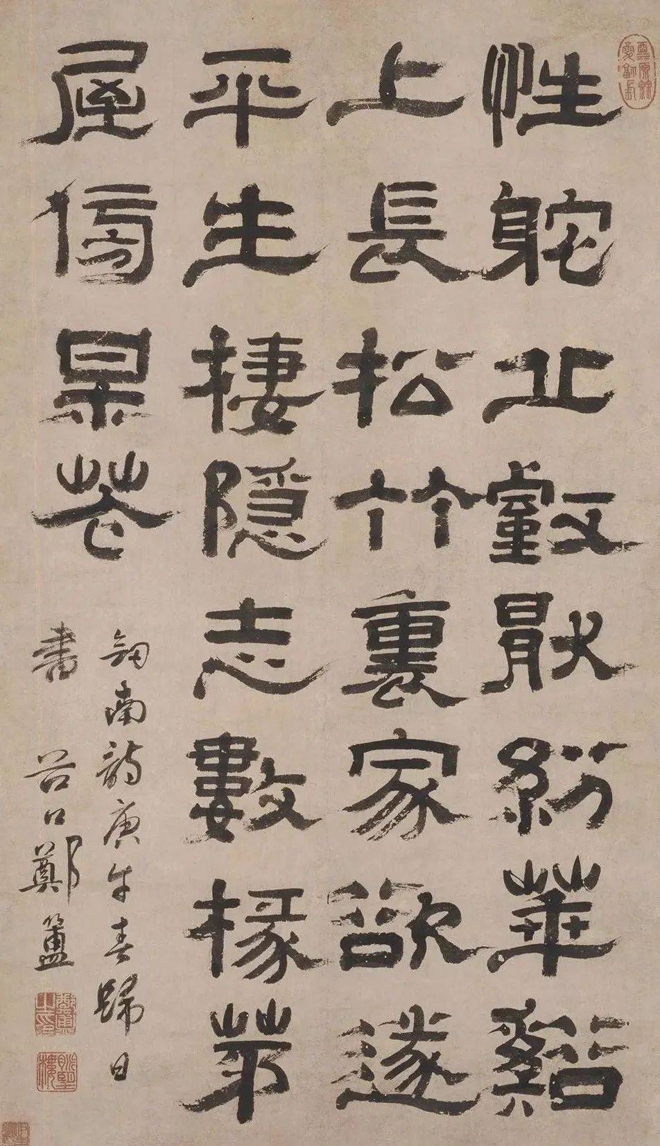 我们一起从郑簠的作品中品味其取法古意,高古浑穆之意。《浣溪沙词轴》是郑簠隶书代表作,个人风貌已经形成。《浣溪沙词轴》具有比较浓厚的篆书意味,书中有篆书的古厚、婉转、苍朴,这使人想到周代鼎文的凝重古意,尽管看不出是哪一家的篆书风格,但是字内的篆意则是可以感知的。郑簠将篆书的沉雄高古融入隶书中,自然让隶书显得不同凡响。