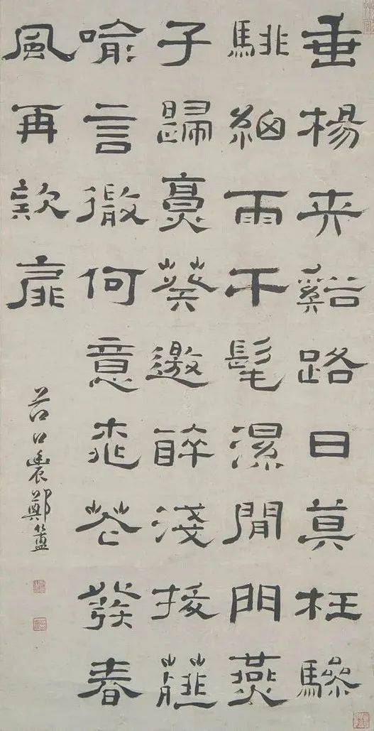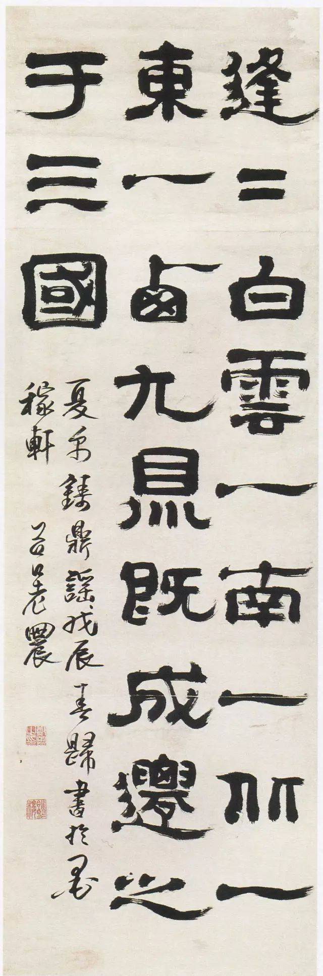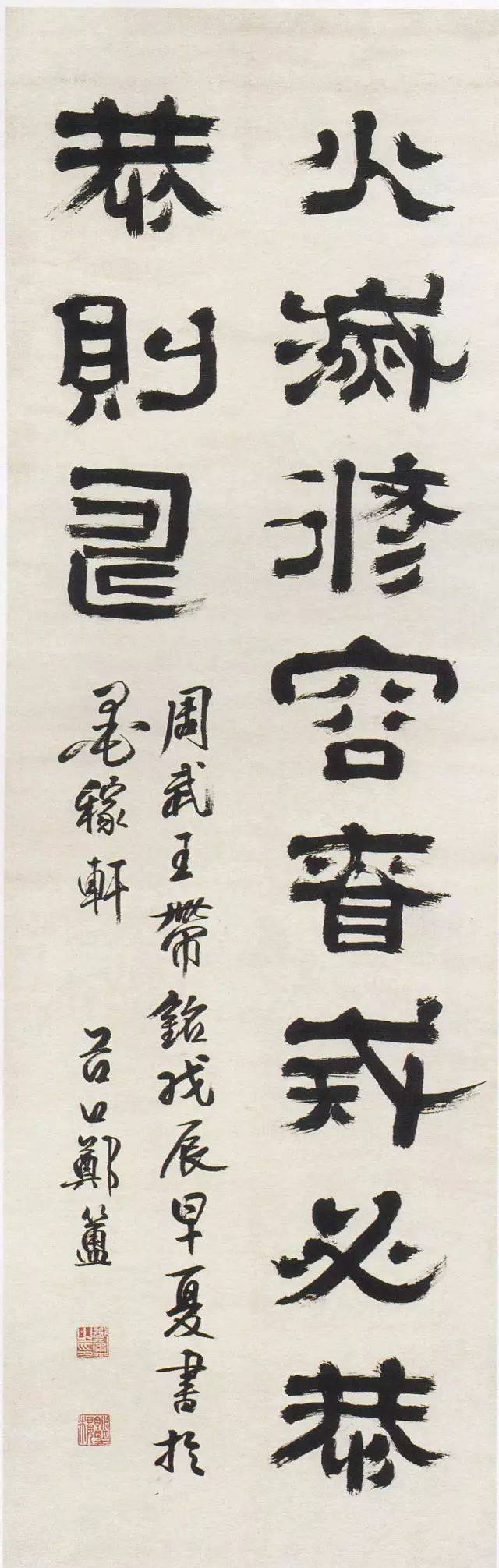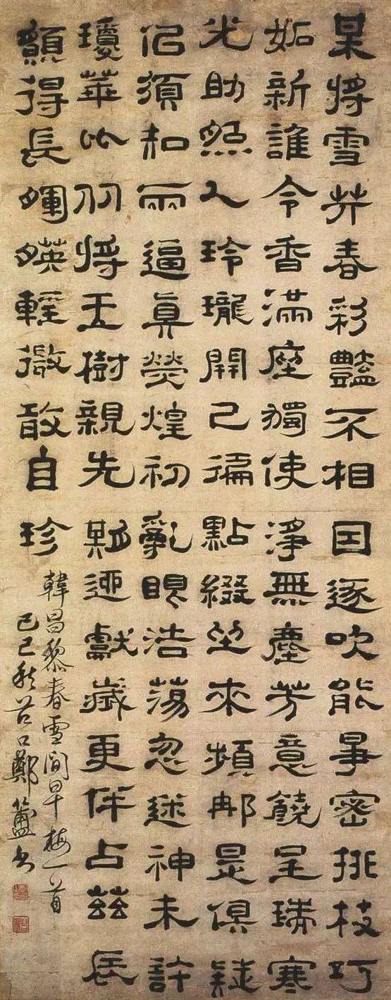 我们一起从郑簠的作品中品味其取法古意,高古浑穆之意。《浣溪沙词轴》是郑簠隶书代表作,个人风貌已经形成。《浣溪沙词轴》具有比较浓厚的篆书意味,书中有篆书的古厚、婉转、苍朴,这使人想到周代鼎文的凝重古意,尽管看不出是哪一家的篆书风格,但是字内的篆意则是可以感知的。郑簠将篆书的沉雄高古融入隶书中,自然让隶书显得不同凡响。