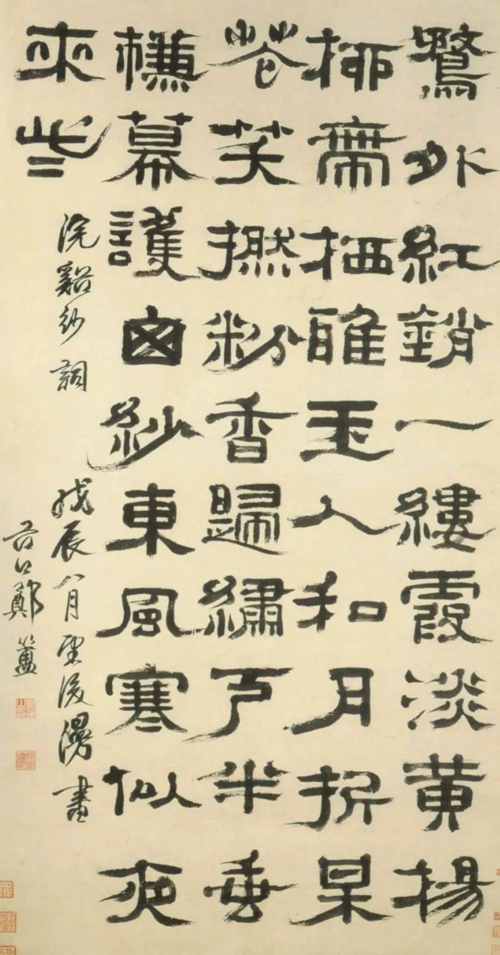 在郑簠《浣溪沙词轴》中充分体现了端庄稳健与奇气两部分。这幅作品是郑簠六十六岁所作,可以说它完全可以体现了郑簠的个人面貌风格。《浣溪沙词轴》一方面运用篆隶笔意,用笔提按分明,笔笔送到位,速度缓和,笔力沉着。这些用笔体现了郑簠隶书的端庄稳健与凝重。另一方面则是用笔带有轻松灵巧,快笔点染的率性,在撇、捺之中,不时可以见到急急而过的动作,是不需要认真的、郑重其事的,只是弹指一挥间的过程,然而趣味和奇气就是来源于此。