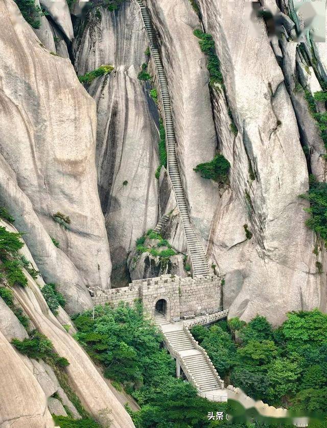 大天门又叫“剪子叉”,西面的覆盆峰和东侧的天狮峰海拔1100以上,相峙而不相连,奇谷天梯是东关最险胜的奇景之一,只有一条能容1人通过的直上直下的狭缝,高下落差80余米,非常险峻沿石阶往回看,就像登天梯