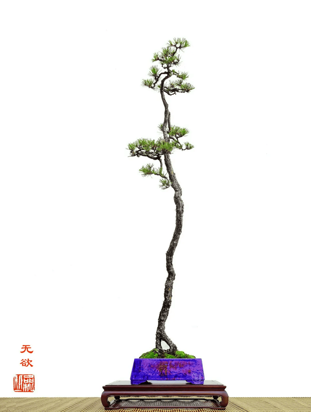 传统正格(规范)盆景,虽有很多形态,但我觉得规范就必然有个规律与框框,较易造成千佛一面的感觉。但山松受自然生存环境的天然造化,生长得千奇百态,远超出人的构思想象,是人为无法造就的。我希望我的作品能体现松树在自然环境中的野趣,看起来自然,少人工匠气。