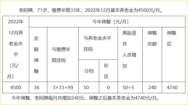 2020年-2024年,北京历年的“定额调整”介于50元到30元。结合挂钩调整及倾斜,北京人社局发布案例称:”李阿姨,71岁、缴费年限33年,2022年12月基本养老金为4500元/月”,2023年调整,李阿姨每月共增加240元”。