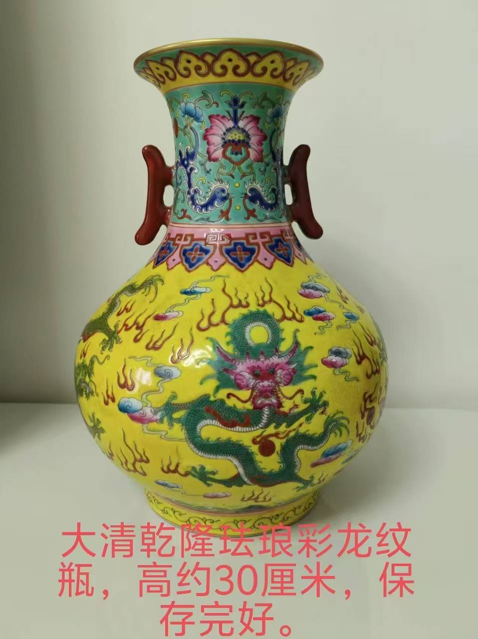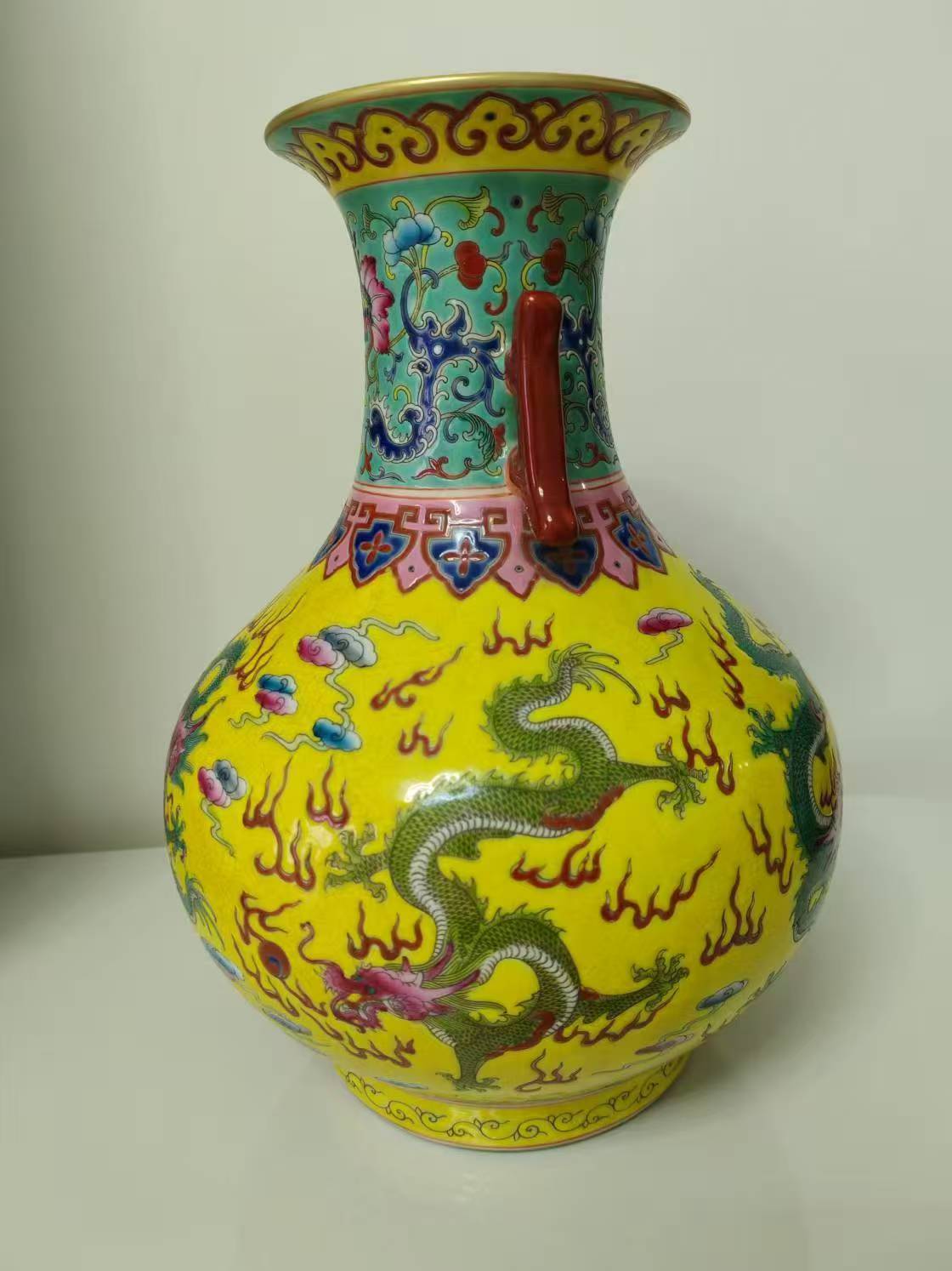 大清乾隆黄釉珐琅彩龙纹赏瓶,造型优美,喇叭囗,丰肩,圆腹,釉面有细碎开片、整体造型端庄大气,线调流畅,比例协调,具有极高的艺术美感。腹部主体纹饰画有五彩龙纹,形态各异,栩栩如生,威武霸气,低温黄釉烧制工艺复杂、难度极大,绘画工艺精妙,皇家气息浓厚,表现力超强,存世量稀少,其收藏价值极高。
