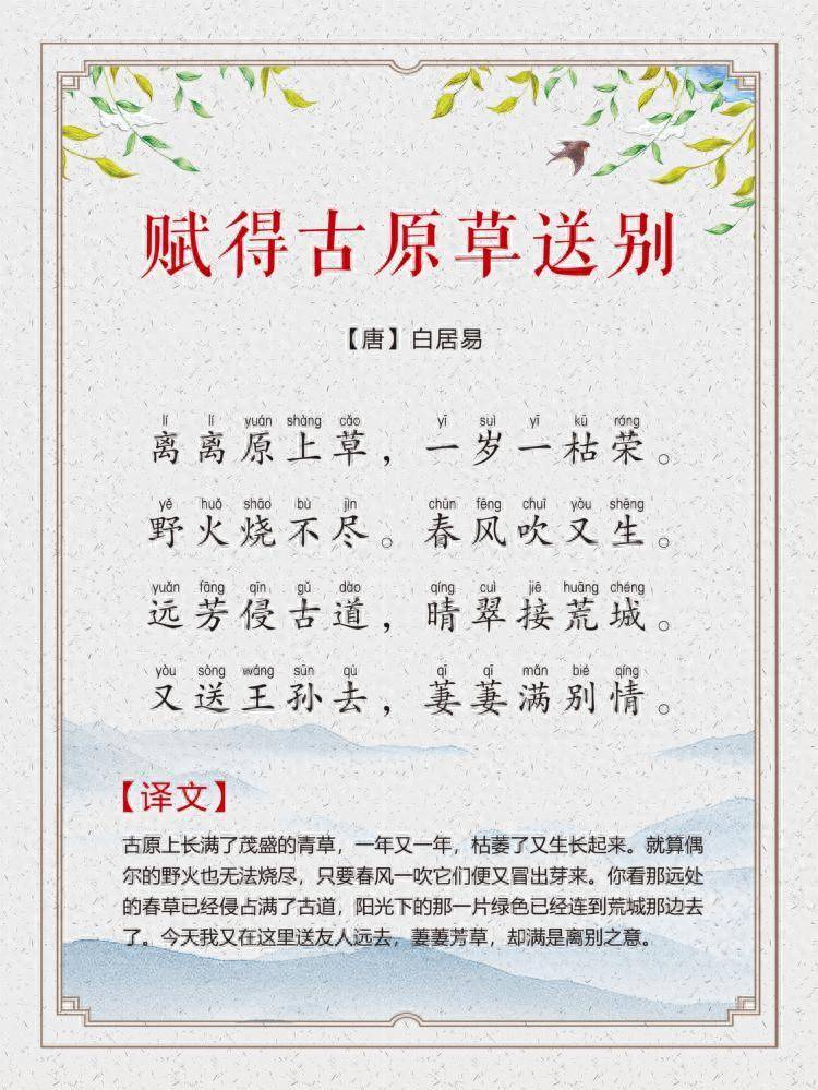 然而,若将后四句的离别情感加入,情况便有所不同。这两句“远芳侵古道,晴翠接荒城”,诗意之浓厚,似乎令人浮想联翩,而“又送王孙去,萋萋满别情”,这便是诗人对离别的深沉感慨。然而,这份情感,未必能为尚处在成长初期的孩子们所理解。对于他们来说,情感过于复杂,难免让他们感到沉重,也可能因理解上的偏差,影响他们对整首诗的体验。因此,课本中的删减,似乎也可以理解。