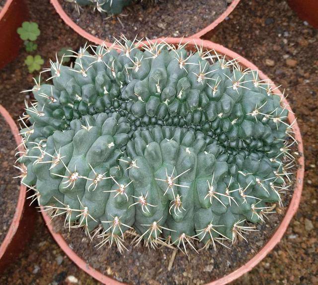 外形特征:植株呈扁球形,表皮墨绿色,刺针状,每个刺座带有5枚灰色周刺,它是仙人球里的小个代表,直径最大差不多也就10厘米的样子。