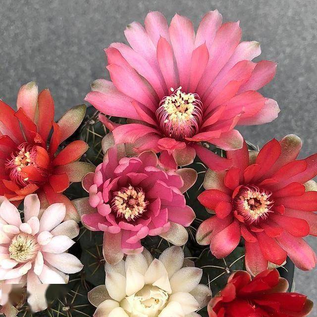 绯花玉的花朵通常长在球体的顶部位置,它一般会在夏季开花,花色也非常地丰富,白色、粉色、白绿、深红等等,不一而足,五彩纷呈。它是仙人球界里妥妥的开花机器,通常花期在5-11月份。